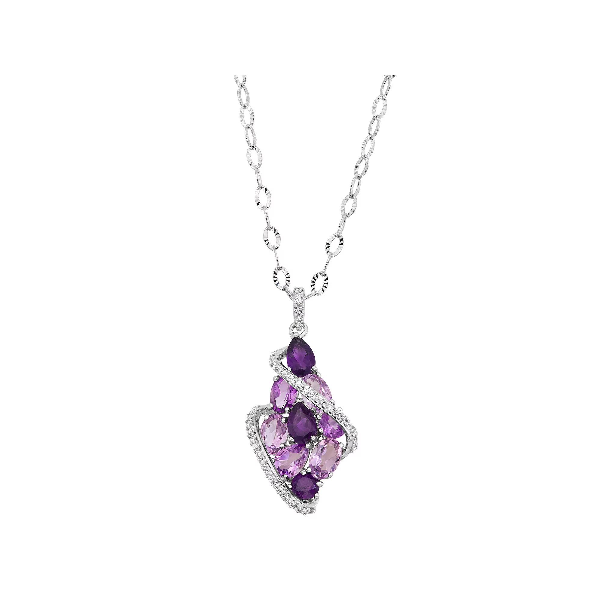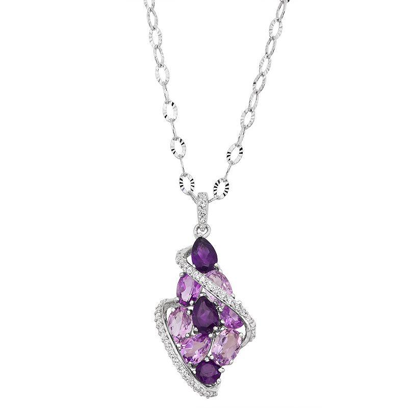 Adorned with an array of vibrant amethyst gemstones, this sterling silver teardrop necklace exudes a radiant look.Click on this JEWELRY & WATCHES GUIDE to learn about fit, styles, materials and more! Metal: sterling silver Chain length: 18 in. Pendant size: 1L x 0.62W Plating: rhodium Packaging: boxed Finish: polished Chain type: diamond-cut fancy chainSTONE DETAILS Stone type: amethyst, lab-created white sapphire Total weight: 3 ct. Shape: oval, pear, round Setting: prong Center stone size: 6 mm x 4 mm Gemstones may have been treated to enhance their appearance. Special care may be required. Please visit our Gemstone Treatment & Special Care Guide for more information. Size: 18. Color: Purple. Gender: female. Age Group: adult.