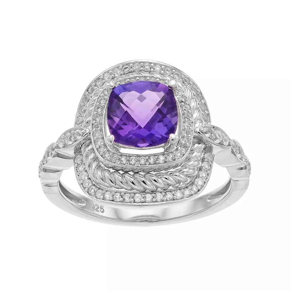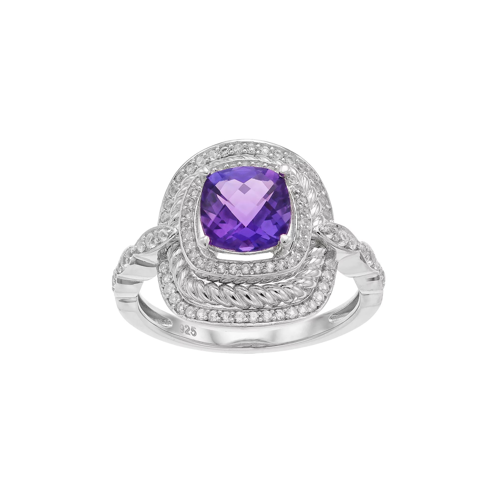 Featuring a cushion-cut genuine amethyst center stone surrounded by rope and lab-created white sapphire accents, this halo ring is impressive.RING DETAILS Width: 0.56 in. Metal: sterling silver Plating: rhodium Finish: polished Packaging: boxed STONE DETAILS Stone type: amethyst, lab-created white sapphire Total weight: 2 1/8 ct. Center stone weight: 1 3/4 ct. Center stone size: 7 mm Shape: cushion cut, round Setting: prong Gemstones may have been treated to enhance their appearance. Special care may be required. Please visit our Gemstone Treatment & Special Care Guide for more information. Color: Purple. Gender: female. Age Group: adult.