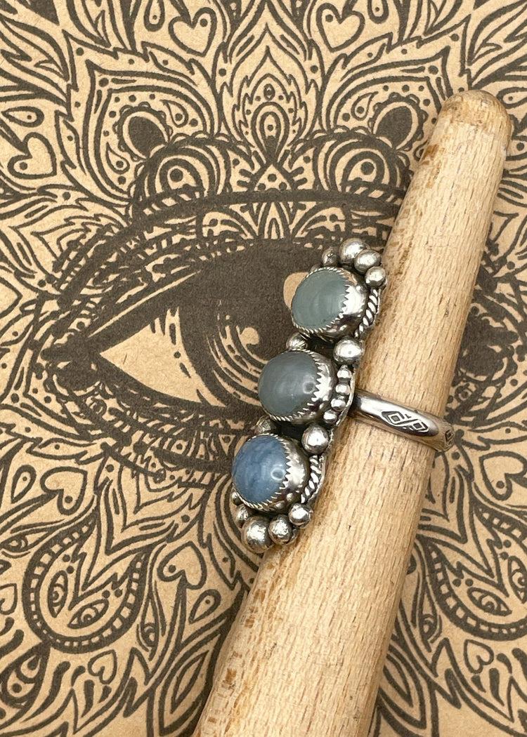 Handmade in California, this one-of-a-kind sterling silver ring features three beautiful aquamarine gemstones, each set in a sterling silver serrated bezel and framed by twisted deco wire and silver balls for an elegant, handcrafted touch. This unique ombre design highlights the beauty and color variants of aquamarine, making it a meaningful and stylish statement piece.925 Sterling SilverRing Size: AdjustableSetting Measurements: 1.80" x 0.70"Care: Gently clean with jewelry polishing cloth.Made in USADesigner: Brigitte Bogart