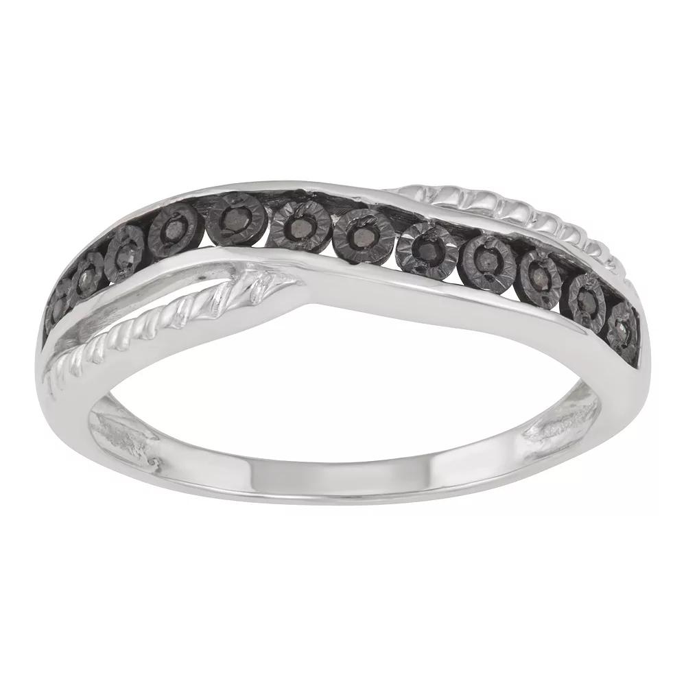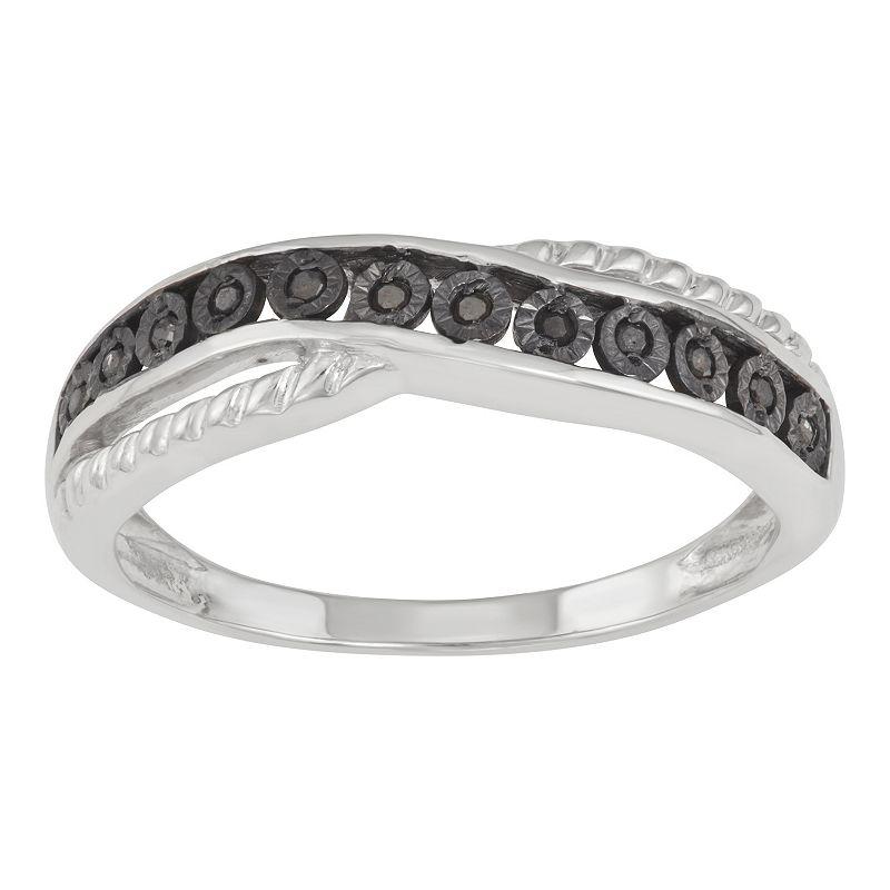 With miracle-set black diamonds and an elegant twist design, this sterling silver ring is an accessory you'll love. With miracle-set black diamonds and an elegant twist design, this sterling silver ring is an accessory you'll love. Nickel free Metal: sterling silver Packaging: boxed Plating: rhodium Width: 5.4 mm Finish: polishedDIAMOND DETAILS Color: black Total weight: less than 1/10 ct. Shape: round Setting: miracle Diamond weights are approximate. Diamond Total Weights may vary between .01 and .13 ct. Some diamonds consist of fewer than 17 facets. Gemstones may have been treated to enhance their appearance. Special care may be required. Please visit our Gemstone Treatment & Special Care Guide for more information. Image(s) may be enlarged to show detail. Please note, due to the high value of this item, a signature may be required upon delivery. Color: White. Gender: female. Age Group: adult.