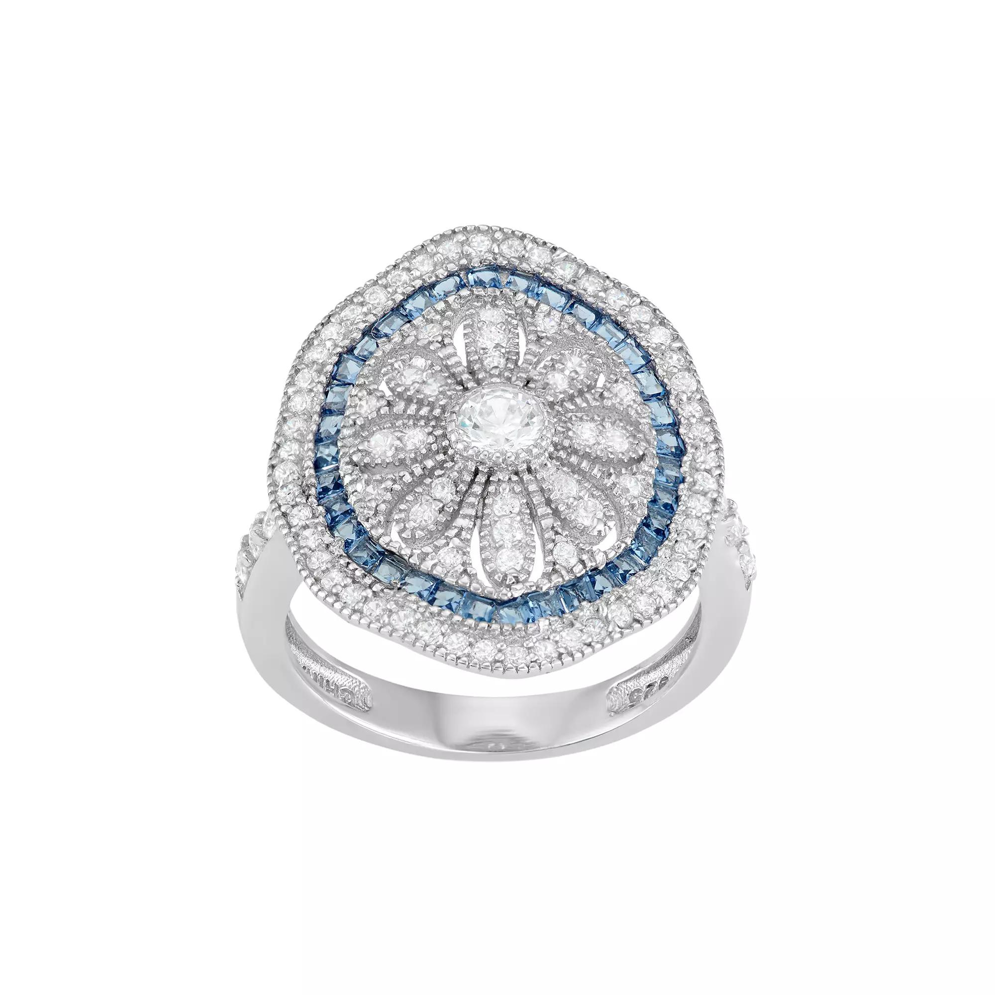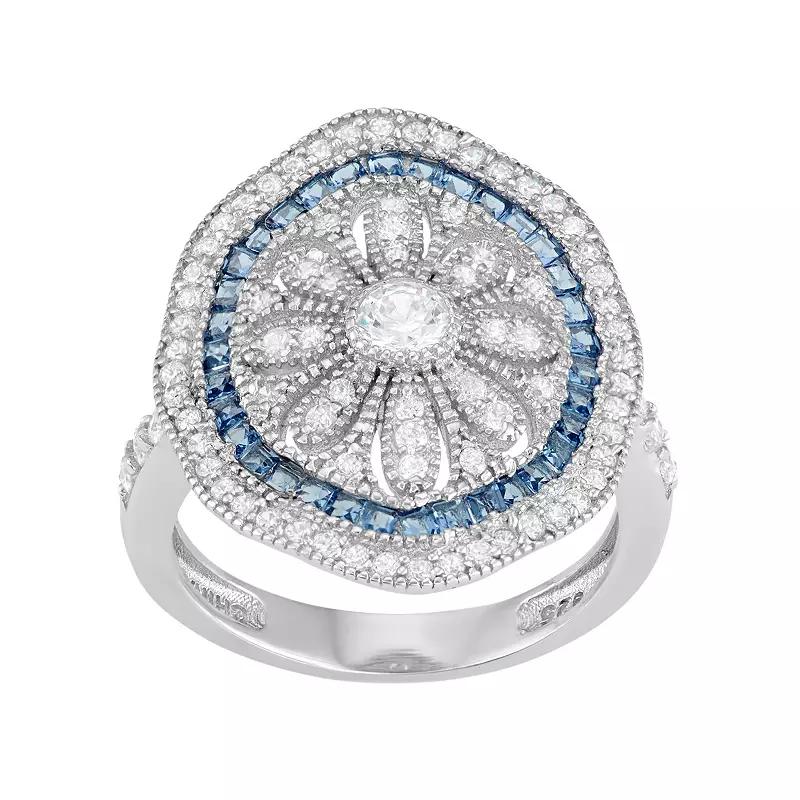 A floral halo motif accentuated with blue glass and cubic zirconia stones gives this sterling silver ring eye-catching beauty. Comes in a gift box.RING DETAILS Width: .88 in. Metal: rhodium-plated sterling silver Features: milgrain details STONE DETAILS Stone type: blue glass Total weight: 2 3/4 ct. Setting: pave CUBIC ZIRCONIA DETAILS Total weight: 2 3/4 ct. Shape: round Setting: pave Size: 7. Gender: female. Age Group: adult.