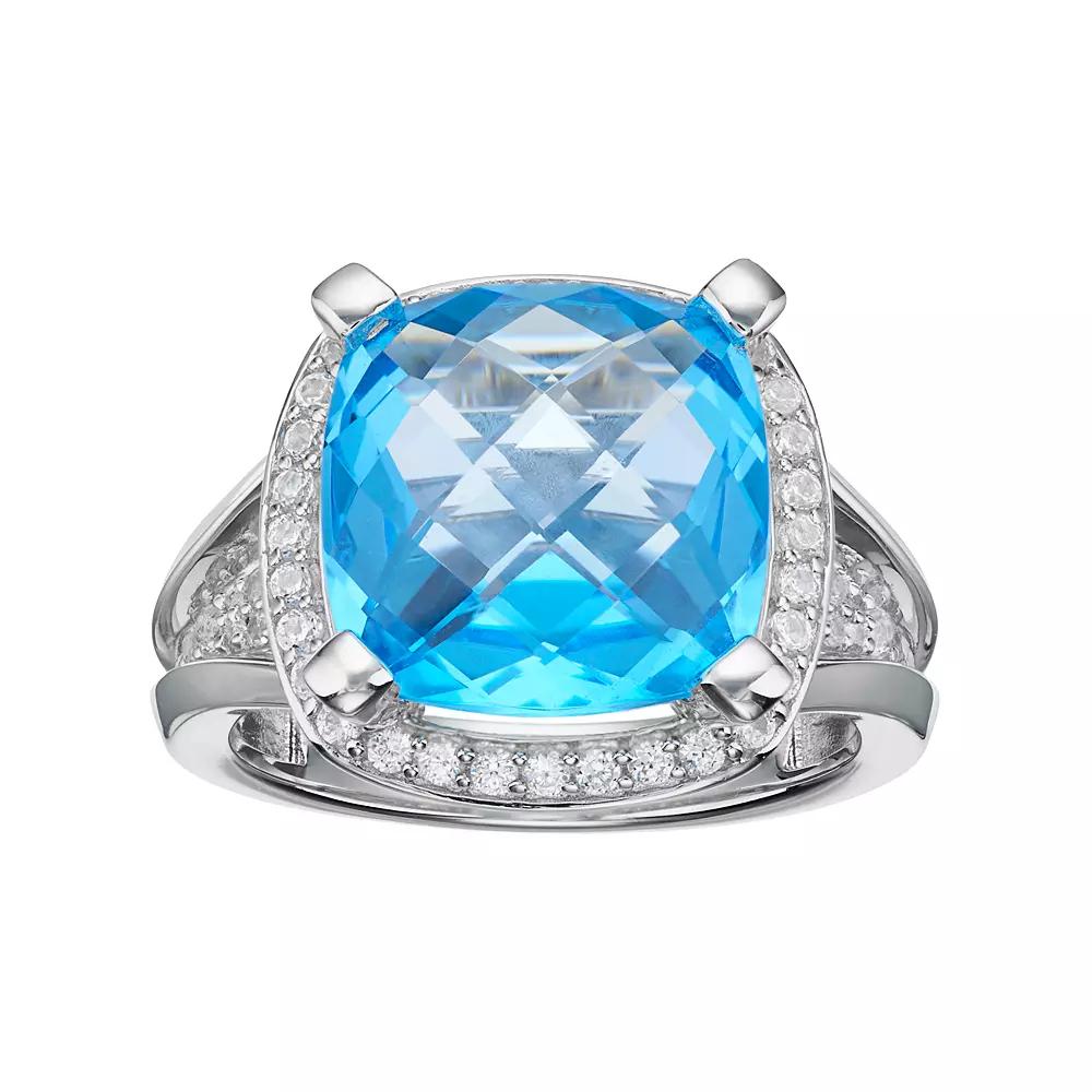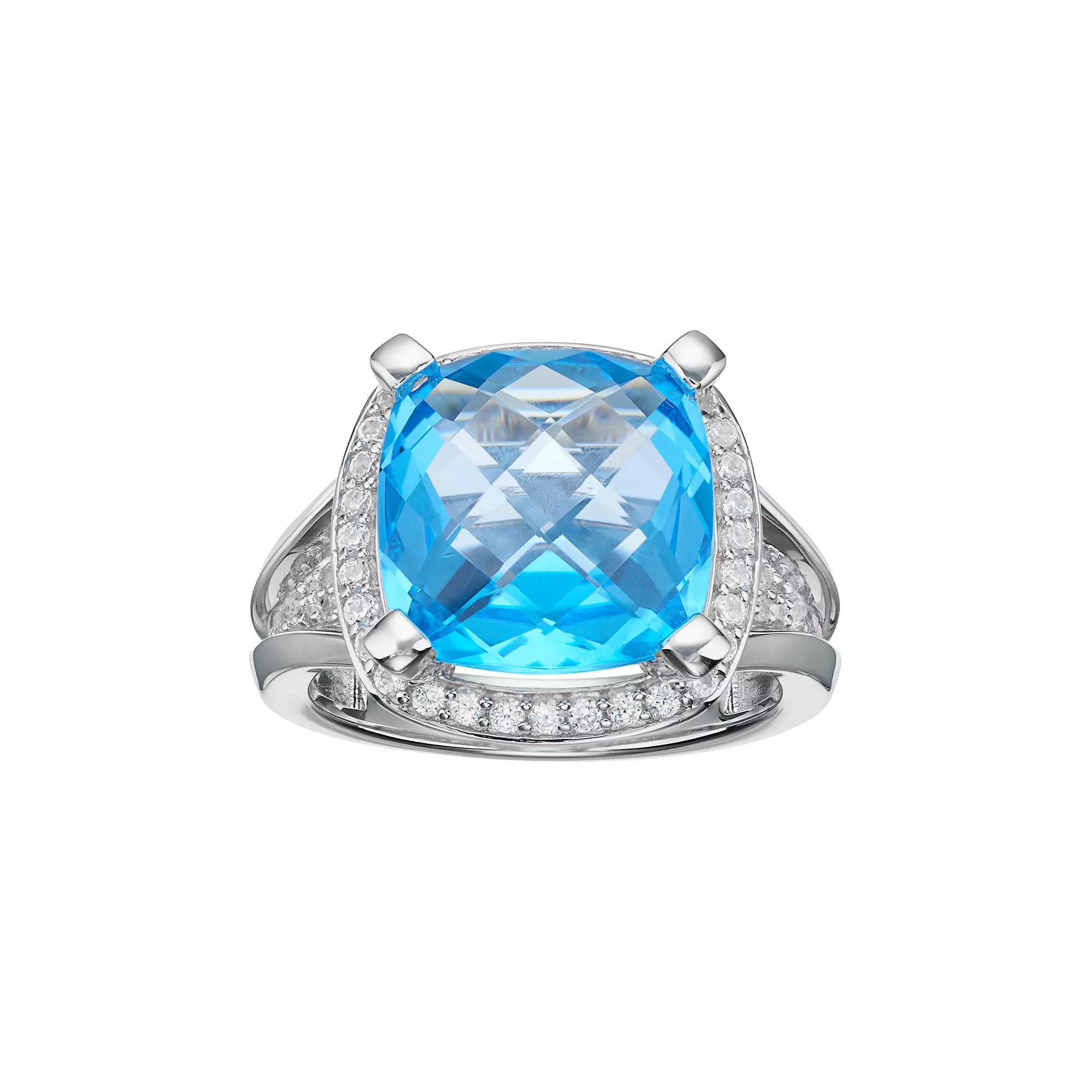 Adorned with a cushion-cut genuine blue topaz center stone surrounded by lab-created white sapphire accents, this tiered halo ring is impressive. Further detailed with lab-created white sapphires along an inner band, this ring is sure to garner compliments. RING DETAILS Width: .55 in. Metal: sterling silver Plating: rhodium Finish: polished STONE DETAILS Stone type: blue topaz, lab-created white sapphire Total weight: 8 1/4 ct. Center stone weight: 7 3/4 ct. Center stone size: 12 mm x 12 mm Shape: cushion cut, round Setting: prong Gemstones may have been treated to enhance their appearance. Special care may be required. Please visit our Gemstone Treatment & Special Care Guide for more information. Size: 6. Gender: female. Age Group: adult.