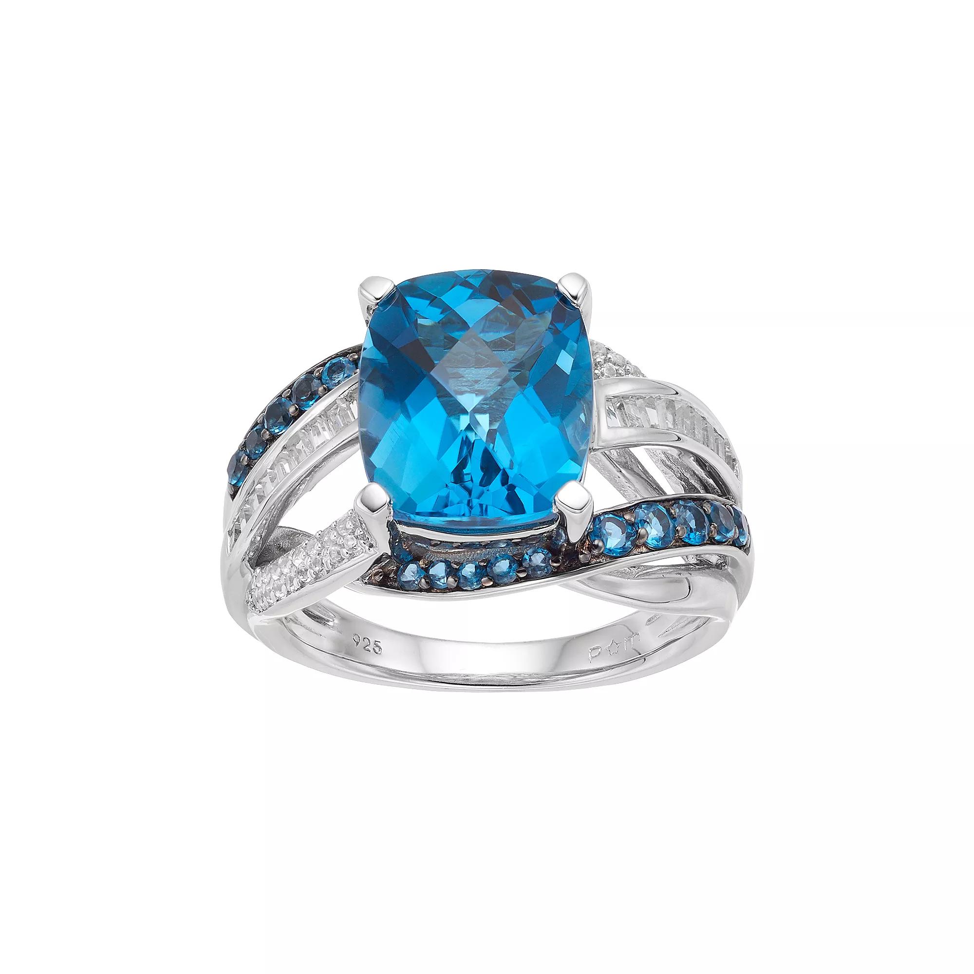 A beautiful combination of genuine blue topaz and lab-created white sapphire stones lends scintillating style to this sterling silver ring.RING DETAILS Width: .48 in. Metal: sterling silver Plating: black rhodium Finish: polished Packaging: boxed STONE DETAILS Stone type: blue topaz, lab-created white sapphire Total weight: 7 ct. Center stone weight: 6 1/3 ct. Center stone size: 12 mm x 10 mm Shape: cushion cut, round, baguette cut Setting: prong, channel Gemstones may have been treated to enhance their appearance. Special care may be required. Gender: female. Age Group: adult.