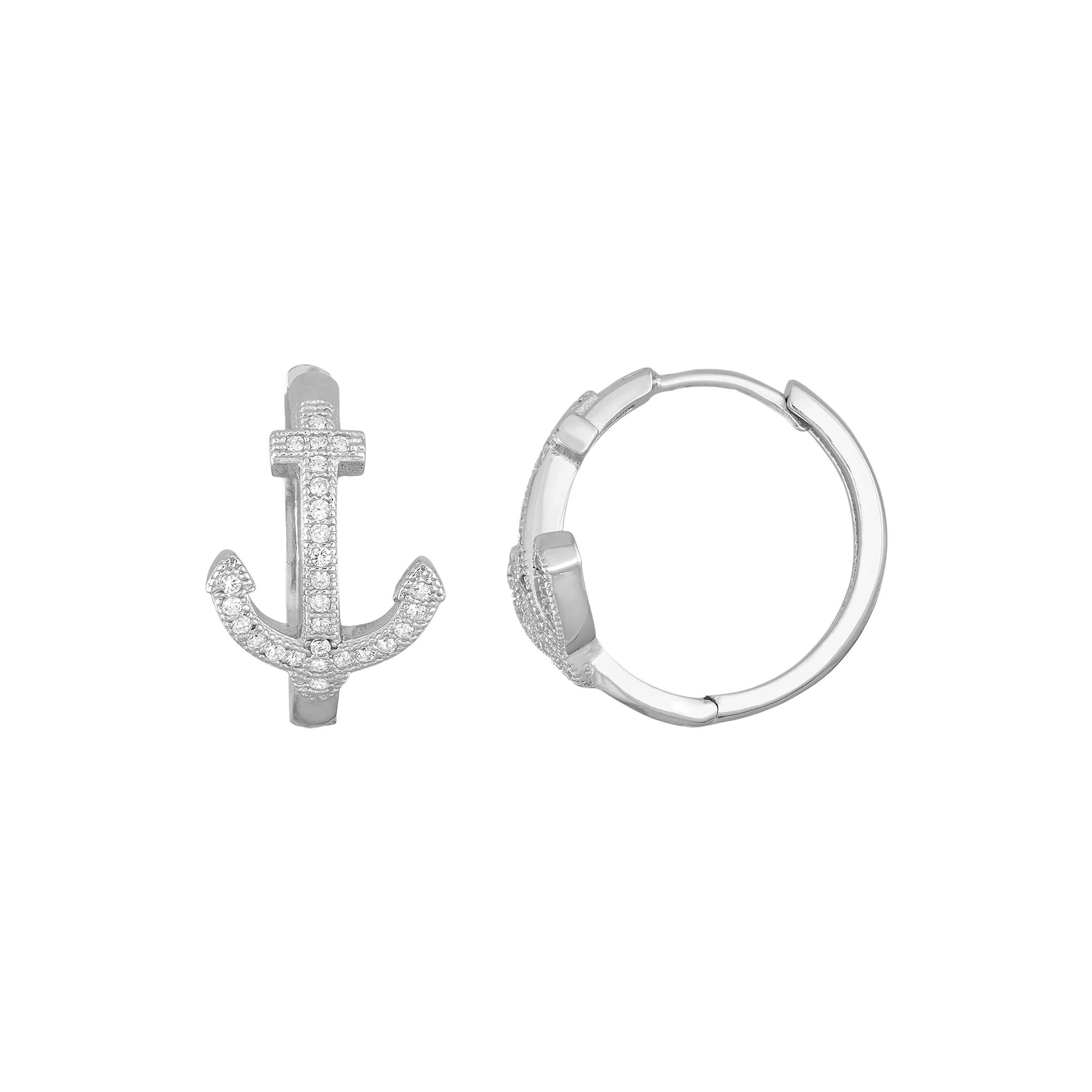 Featuring eye-catching cubic zirconia stones and an anchor design, these sterling silver hoop earrings offer seaside style. Comes in a gift box. EARRING DETAILS Length: .68 in. Backings: click-it Metal: rhodium-plated sterling silver CUBIC ZIRCONIA DETAILS Total weight: 3/8 ct. Shape: round Setting: pave Size: One Size. Color: White. Gender: female. Age Group: adult.