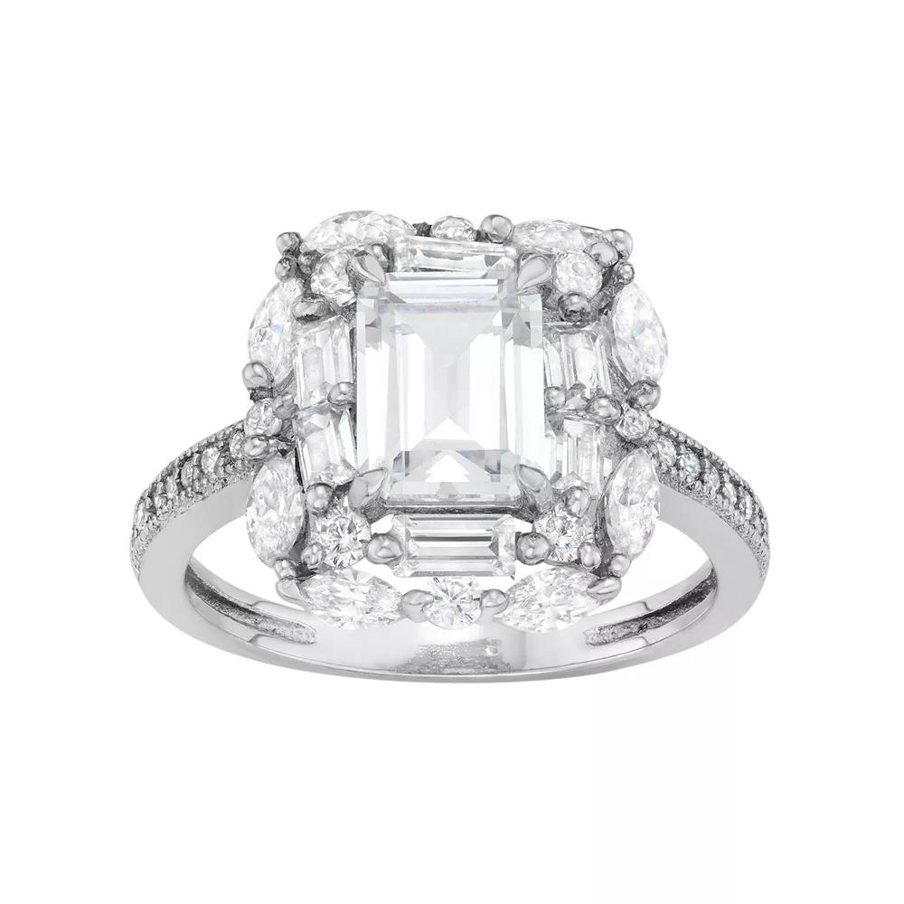Decorated with cubic zirconia stones in a variety of shapes, this rectangle halo ring abounds with sophisticated style.RING DETAILS Width: .6 in. Metal: sterling silver Plating: rhodium Packaging: boxed CUBIC ZIRCONIA DETAILS Total weight: 5 1/10 ct. Center stone weight: 2 3/4 ct. Shape: emerald cut, marquise, round Gemstones may have been treated to enhance their appearance. Special care may be required. Please visit our Gemstone Treatment & Special Care Guide for more information. Size: 7. Color: White. Gender: female. Age Group: adult.