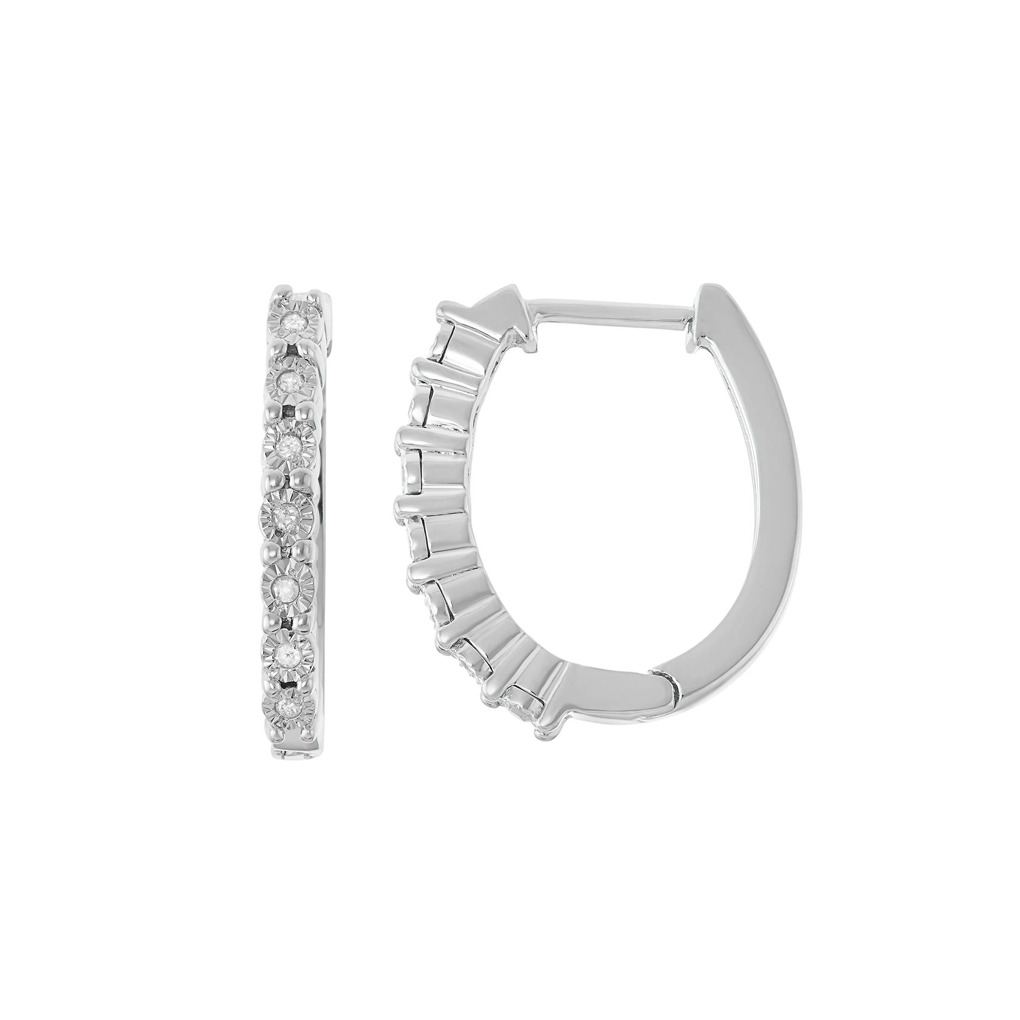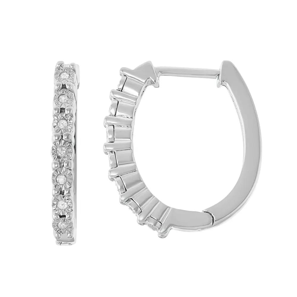 You're sure to captivate when you wear these sterling silver hoop earrings.EARRING DETAILS Length: .63 in. Backings: click-it Metal: sterling silver Plating: rhodium DIAMOND DETAILS Total weight: less than 1/10 ct. Shape: single cut Color grade: H-I Clarity: I1-I2 Setting: prong Gemstones may have been treated to enhance their appearance. Special care may be required. Please visit our Gemstone Treatment & Special Care Guide for more information. Image(s) may be enlarged to show detail.Diamond weights are approximate. Diamond total weights may vary between .01 and .08 ct. Some diamonds have fewer than 17 facets. Size: One Size. Color: White. Gender: female. Age Group: adult. Material: Sterling Silver Rhodium.