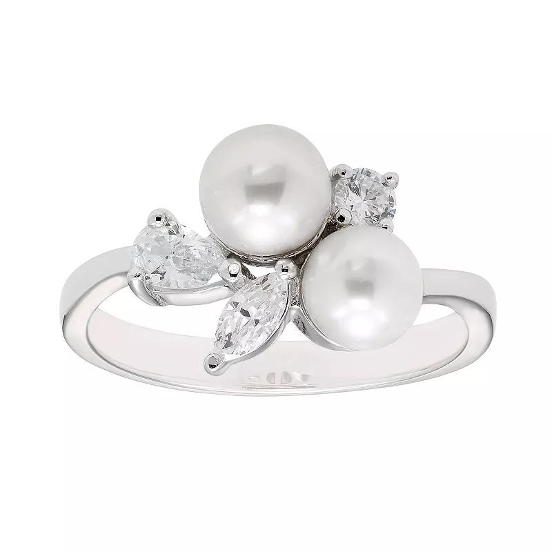 Featuring a pair of lustrous freshwater cultured pearls accented by pear-, marquis-, and round-cut cubic zirconia stones, this sterling silver ring lends a touch of elegance to your look. Featuring a pair of lustrous freshwater cultured pearls accented by pear-, marquis-, and round-cut cubic zirconia stones, this sterling silver ring lends a touch of elegance to your look. Width: 10.92 mm Metal: sterling silver Plating: rhodium Finish: polished Additional details: CZ accents Packaging: boxed CULTURED PEARL DETAILS Type: freshwater Size: 5.5 mm - 6 mm Shape: near round Color: white Gift Givers: This item ships in its original packaging. If intended as a gift, the packaging may reveal the contents. Gemstones may have been treated to enhance their appearance. Special care may be required. Please visit our Gemstone Treatment & Special Care Guide for more information. Please note, a signature may be required upon delivery. Size: 7. Gender: female. Age Group: adult.