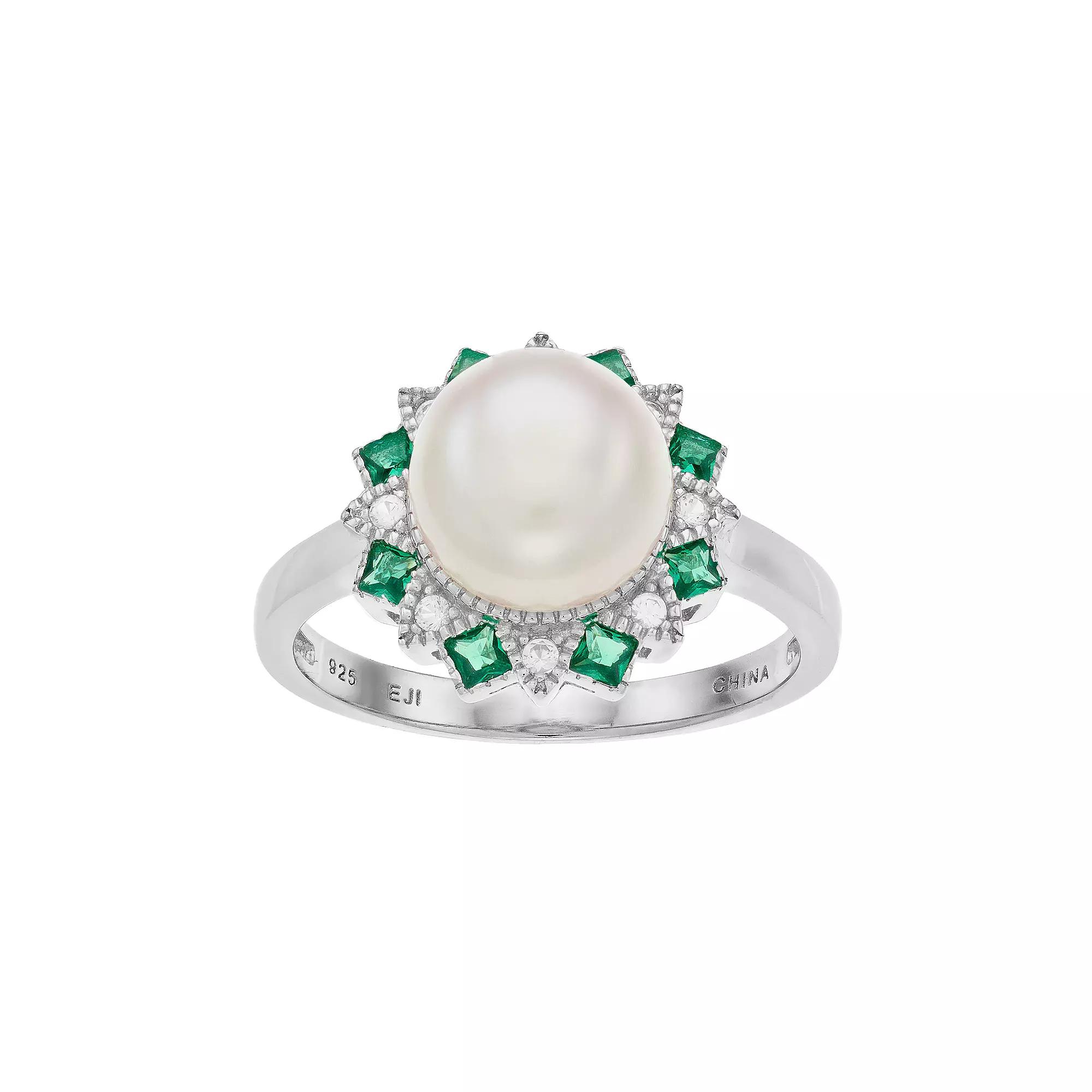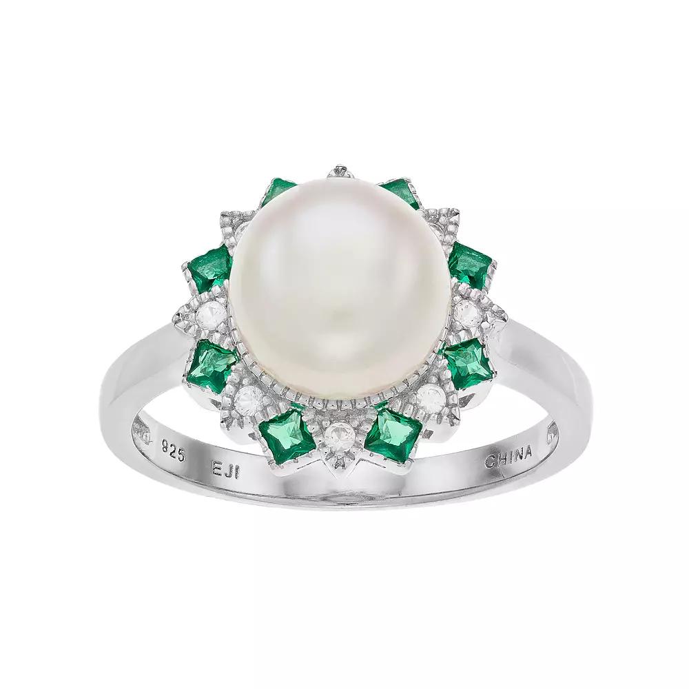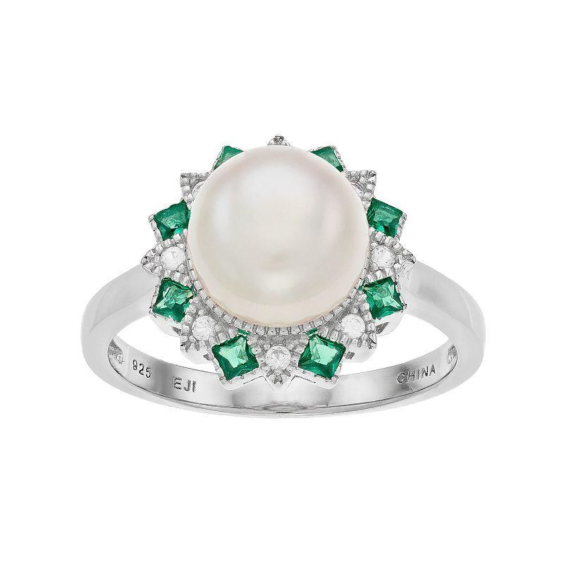 Designed with a lustrous freshwater cultured pearl and lab-created green spinels, this sterling silver ring is simply beautiful.RING DETAILS Width: 14 mm Metal: sterling silver Plating: rhodium Packaging: boxed STONE DETAILS Stone type: lab-created green spinel, lab-created white sapphire Total weight: 1/2 ct. Shape: round Setting: prong CULTURED PEARL DETAILS Type: freshwater Shape: button Size: 8 mm - 8.5 mm Color: white Gemstones may have been treated to enhance their appearance. Special care may be required. Please visit our Gemstone Treatment & Special Care Guide for more information. Size: 6. Gender: female. Age Group: adult.