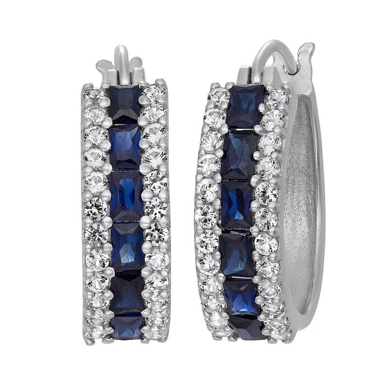 Covered in pave-set, lab-created blue and white sapphire stones, these hoop earrings are positively radiant.Earring Details: Length: .7 in. Backings: click-it Metal: rhodium-plated sterling silver Stone Details: Stone type: lab-created blue sapphire, lab-created white sapphire Cut: emerald, round Setting: pave Size: One Size. Gender: female. Age Group: adult.