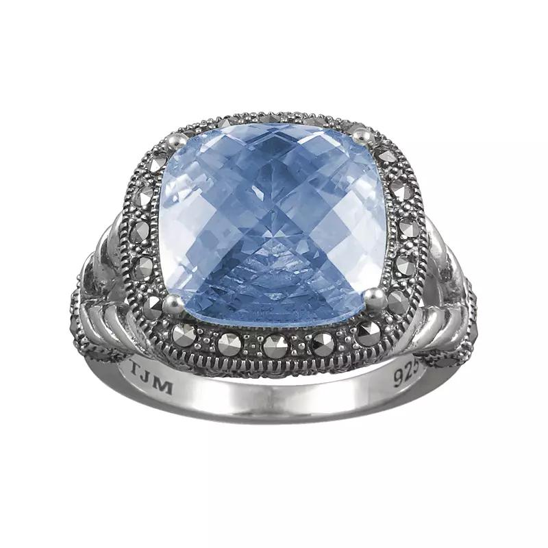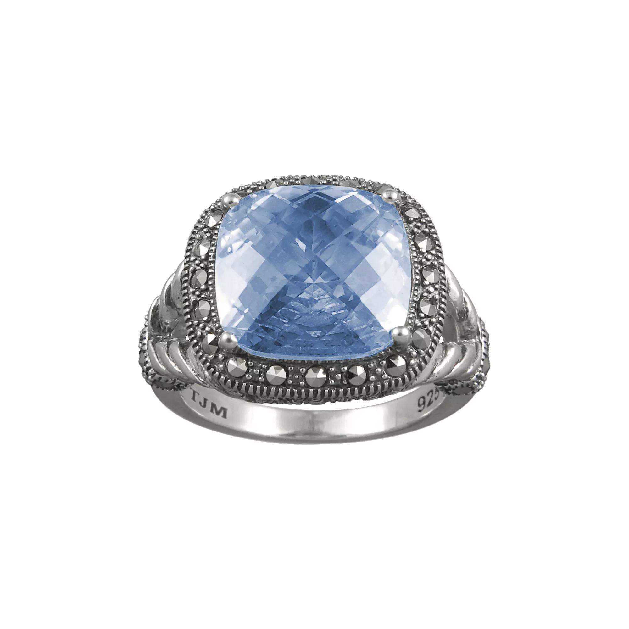 Featuring lab-created blue quartz and marcasite stones, this sterling silver frame ring offers eye-catching beauty.Ring Details: Width: 0.8 in. Metal: sterling silver Features:milgrain details & split shank design Gemstone Details: Type: lab-created blue quartz Cut: cushion Color: blue Setting: prong Size: 7. Gender: female. Age Group: adult.