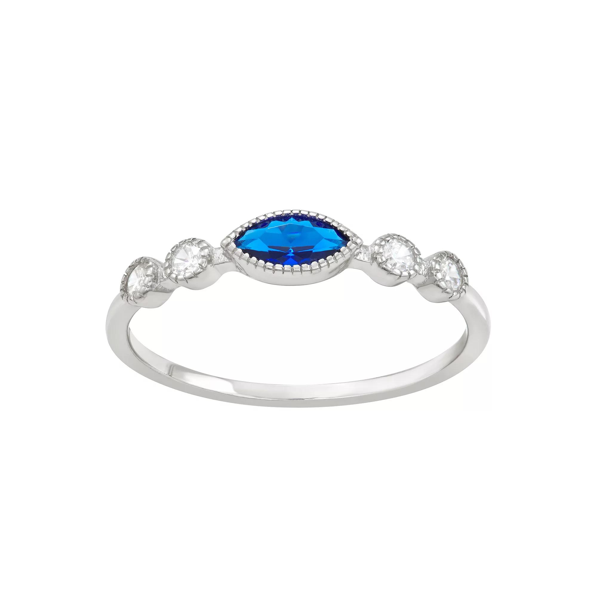 Featuring lab-created blue spinel and cubic zirconia stones, this stylish sterling silver ring dazzles from every direction. Featuring lab-created blue spinel and cubic zirconia stones, this stylish sterling silver ring dazzles from every direction. Width: 4.2 mm Metal: sterling silver Plating: rhodium Finish: polished Packaging: boxedSTONE DETAILS Stone type: cubic zirconia, lab-created spinel Total weight: 5/8 ct. Center stone weight: 1/3 ct. Center stone size: 3 mm x 6 mm Shape: marquise, round Setting: bezel Gemstones may have been treated to enhance their appearance. Special care may be required. Please visit our Gemstone Treatment & Special Care Guide for more information. Please note, due to the high value of this item, a signature may be required upon delivery. Gender: female. Age Group: adult.