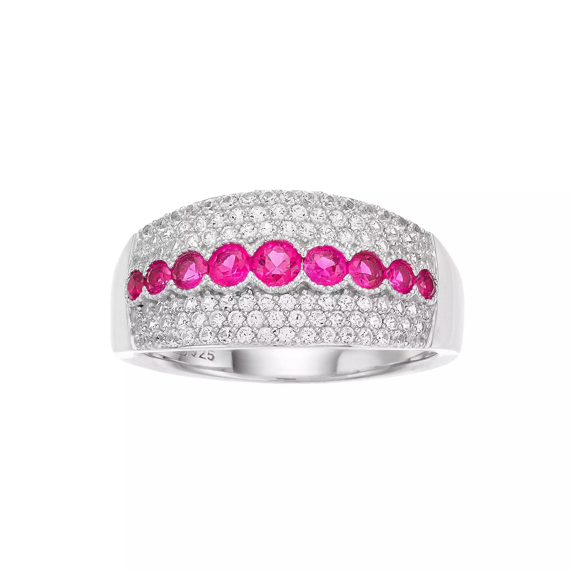 Embellished with a row of lab-created gemstones surrounded by dazzling white sapphire stones, this sterling silver ring is absolutely captivating. Embellished with a row of lab-created gemstones surrounded by dazzling white sapphire stones, this sterling silver ring is absolutely captivating. RING DETAILS Width: 0.41 in. Metal: sterling silver Finish: polishedSTONE DETAILS Stone type: lab-created white sapphire Total weight: 7/8 ct. Shape: round Setting: bezel, micro prong Gemstones may have been treated to enhance their appearance. Special care may be required. Please visit our Gemstone Treatment & Special Care Guide for more information. Size: 6. Gender: female. Age Group: adult.