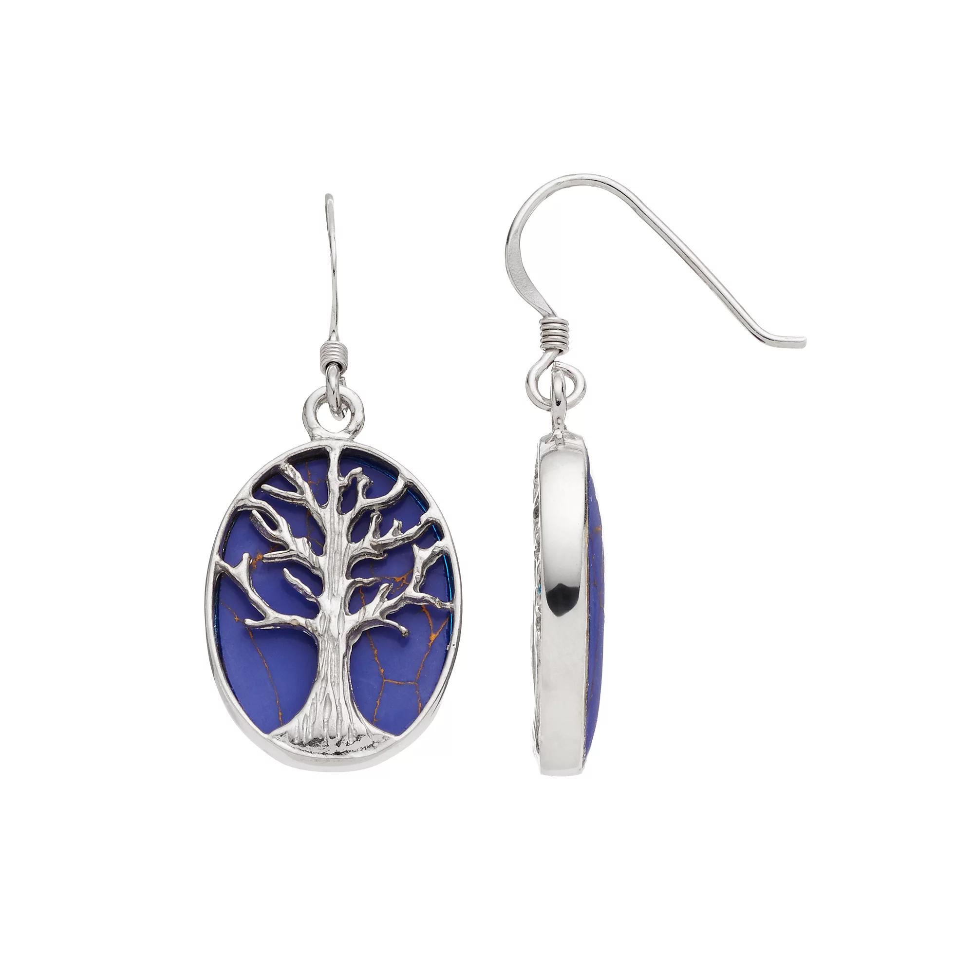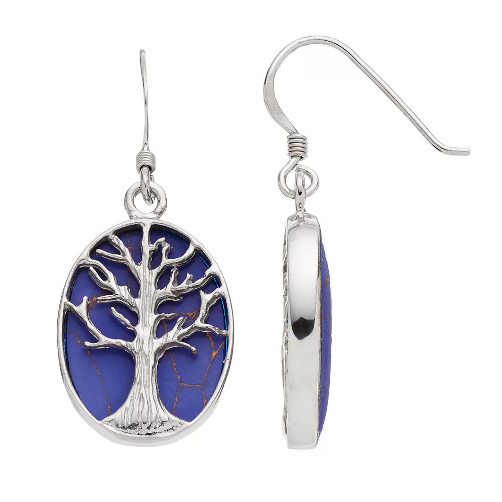 Accentuated with a tree of life motif and lab-created lapis lazuli stones, these oval drop earrings provide eye-catching beauty.EARRING DETAILS Length: 1.46 in. Backings: fishhook Metal: sterling silver Plating: rhodium Packaging: boxed STONE DETAILS Stone type: lab-created lapis lazuli Total weight: 16 ct. Center stone size: 14 mm x 19 mm Shape: oval cabochon Setting: bezel Gemstones may have been treated to enhance their appearance. Special care may be required. Color: Blue. Gender: female. Age Group: adult. Material: Sterling Silver Rhodium.