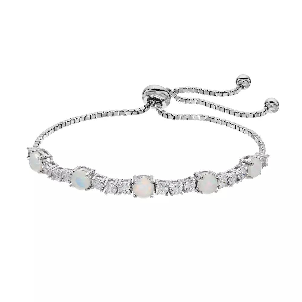 You're sure to captivate when you wear this enchanting lab-created opal bolo bracelet.BRACELET DETAILSLength: adjusts to 8 in.Clasp: sliderMetal: sterling silverPlating: rhodiumSTONE DETAILSStone type: lab-created opalTotal weight: 2 1/2 ct.Shape:...