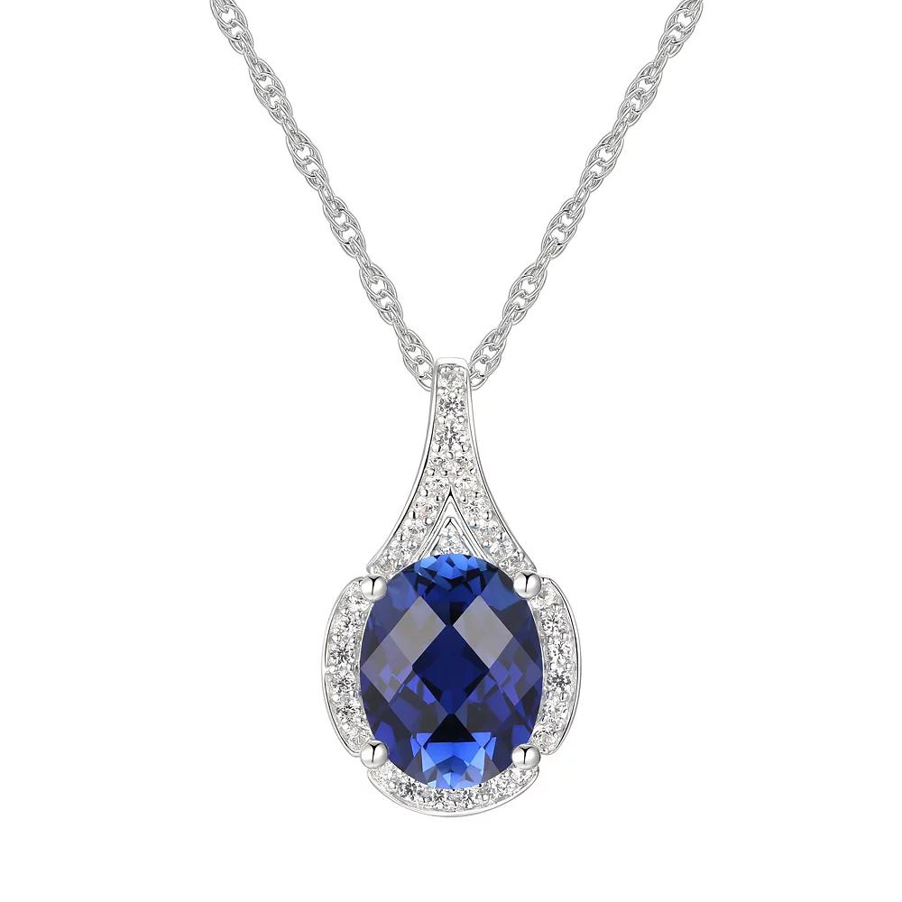 Add timeless elegance to your jewelry collection with this Sterling Silver Lab-Created Sapphire Pendant. Add timeless elegance to your jewelry collection with this Sterling Silver Lab-Created Sapphire Pendant. FEATURES Pendant dimensions: 0.67''x0.37'' Chain length: 18 in. Chain type: rope Clasp: spring-ring Nickel free Metal: sterling silver Plating: rhodium Finish: polished Packaging: boxedSTONE DETAILS Stone type: lab-created sapphire, lab-created white sapphire Total weight: 2 3/8 ct. Center stone weight: 2 1/4 ct. Center stone size: 9X7mm Shape: oval, shape: round Setting: prong Gemstones may have been treated to enhance their appearance. Special care may be required. Please visit our Gemstone Treatment & Special Care Guide for more information. Size: 18". Gender: female. Age Group: adult.