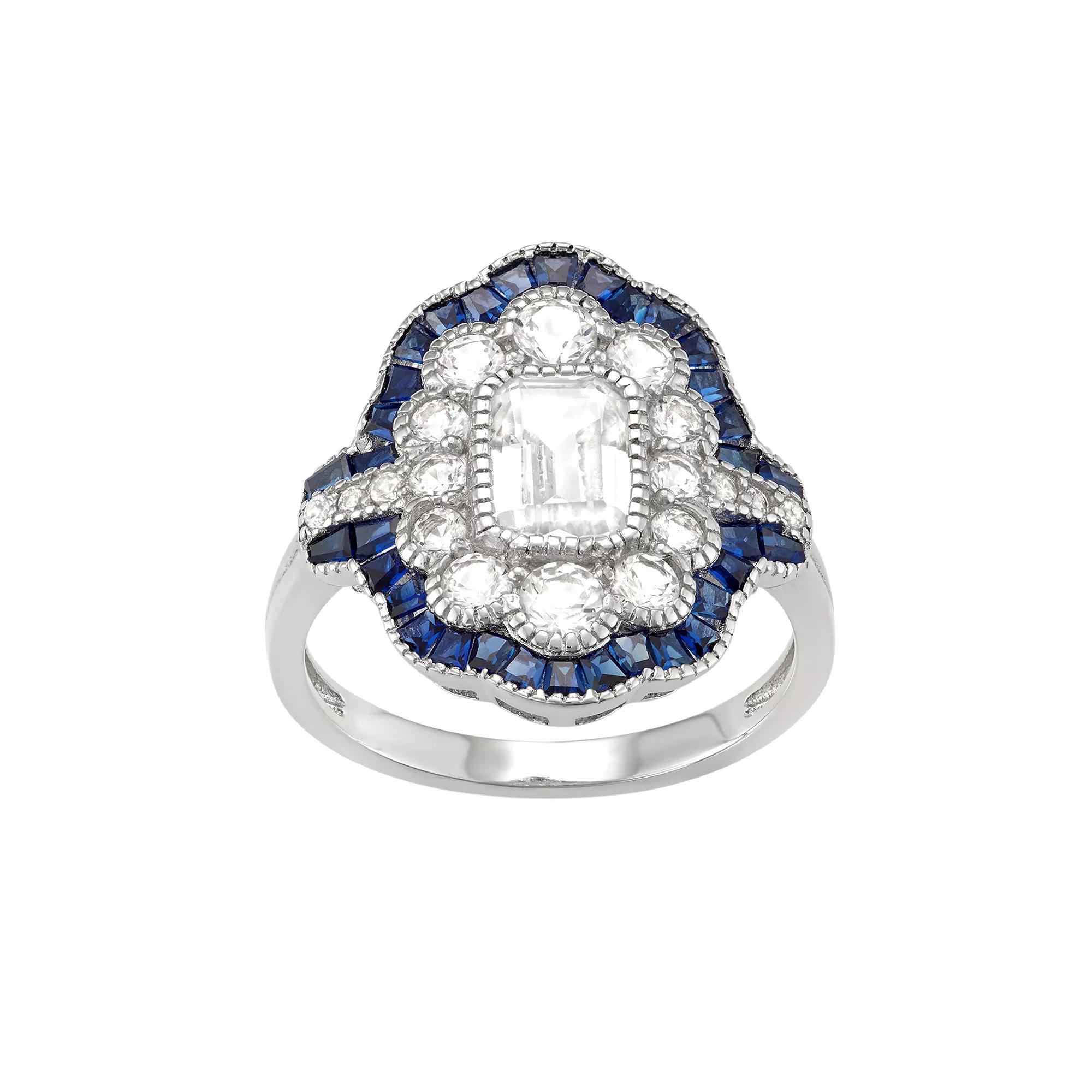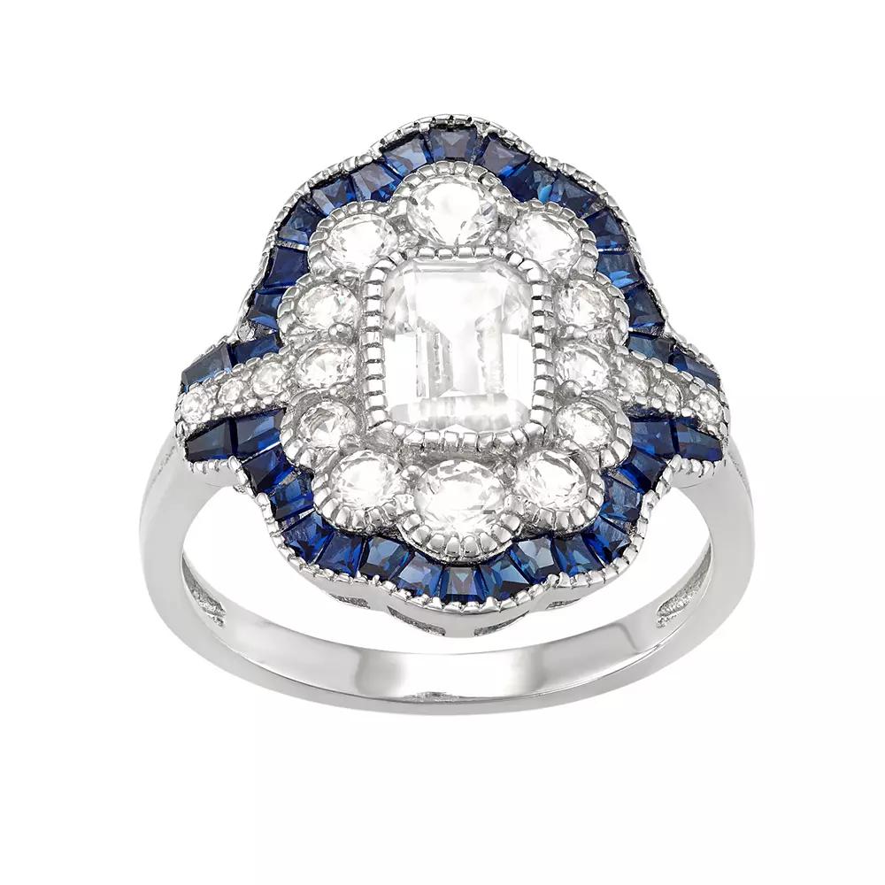 Adorned with striking lab-created white and blue sapphire gemstones, this art-deco inspired ring offers a luxurious way to elevate your ensemble. Comes in a gift box. RING DETAILS Width: .7 in. Metal: rhodium-plated sterling silver STONE DETAILS Stone type: lab-created white sapphire, lab-created blue sapphire Total weight: 2 7/8 ct. Shape: octagon, round, baguette Setting: bezel, pave, channel Gender: female. Age Group: adult.