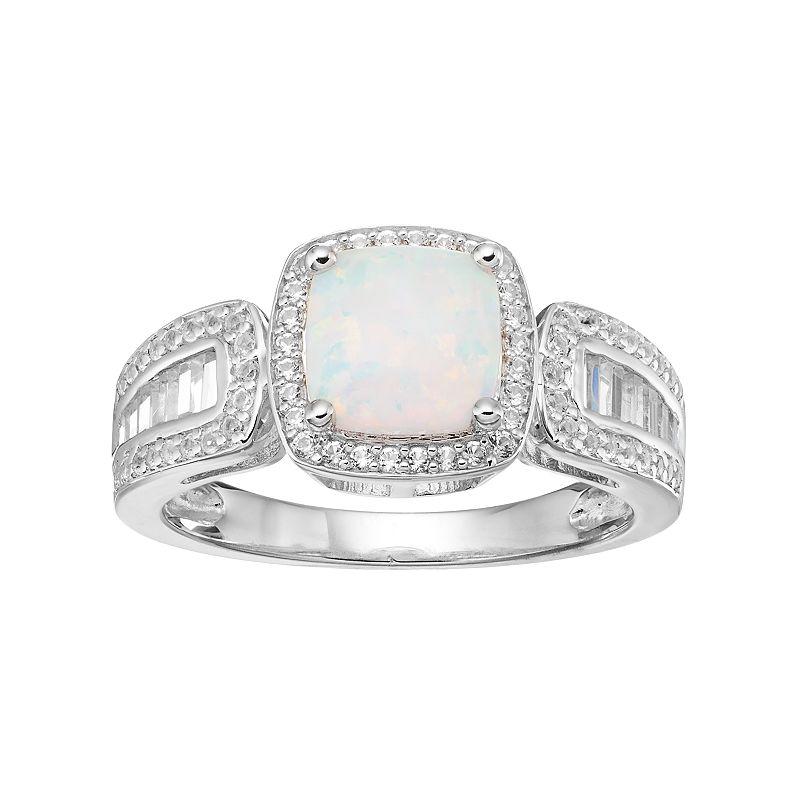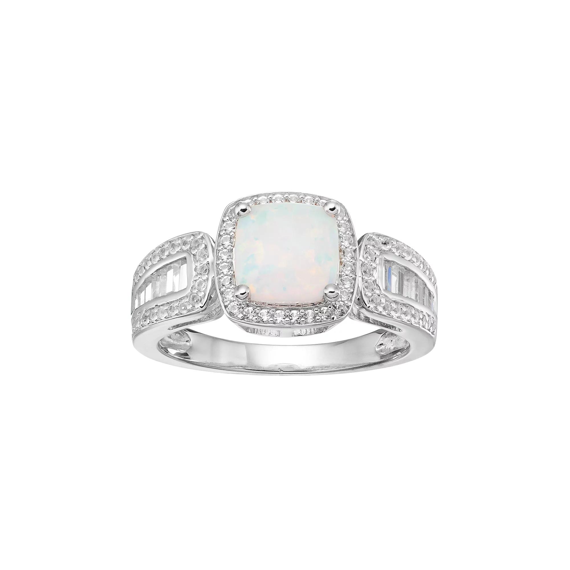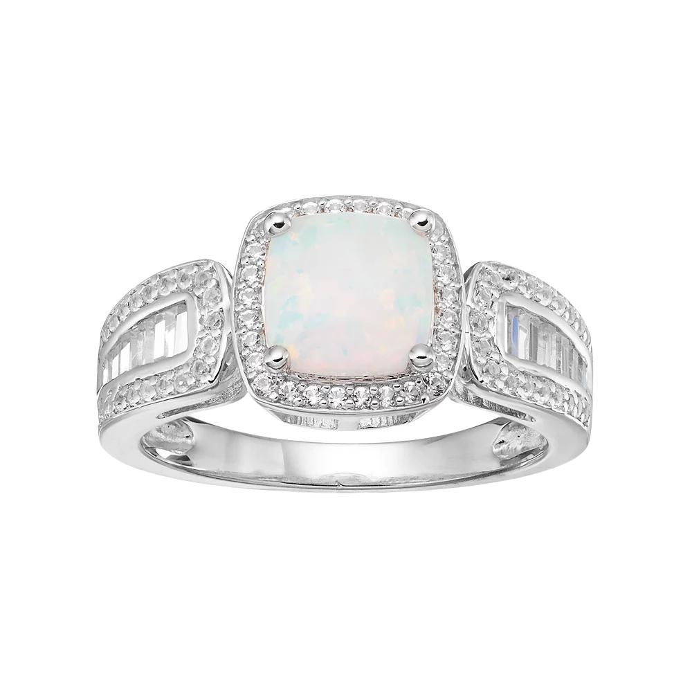 Adorned with a lab-created white opal center stone, and baguette- and round-cut, lab-created white sapphire accents, this halo ring makes a captivating accessory.RING DETAILS Width: 9.2 mm Metal: sterling silver Plating: rhodium Finish: polished STONE DETAILS Stone type: lab-created white opal, lab-created white sapphire Total weight: 1 5/8 ct. Center stone weight: 1 ct. Center stone size: 7 mm x 7 mm Shape: cushion-cut cabochon, baguette cut, round Setting: prong, channel Gemstones may have been treated to enhance their appearance. Special care may be required. Please visit our Gemstone Treatment & Special Care Guide for more information. Gender: female. Age Group: adult.