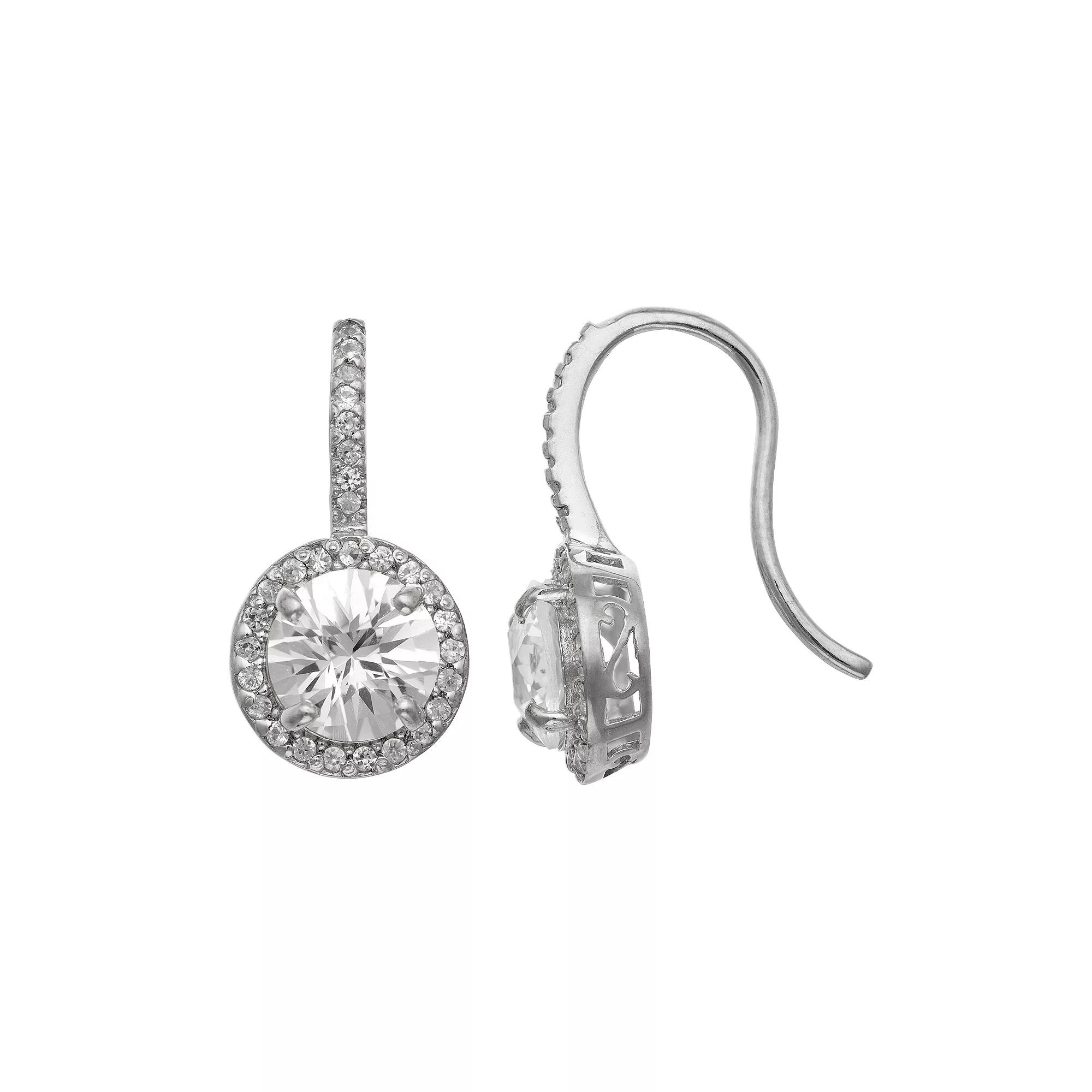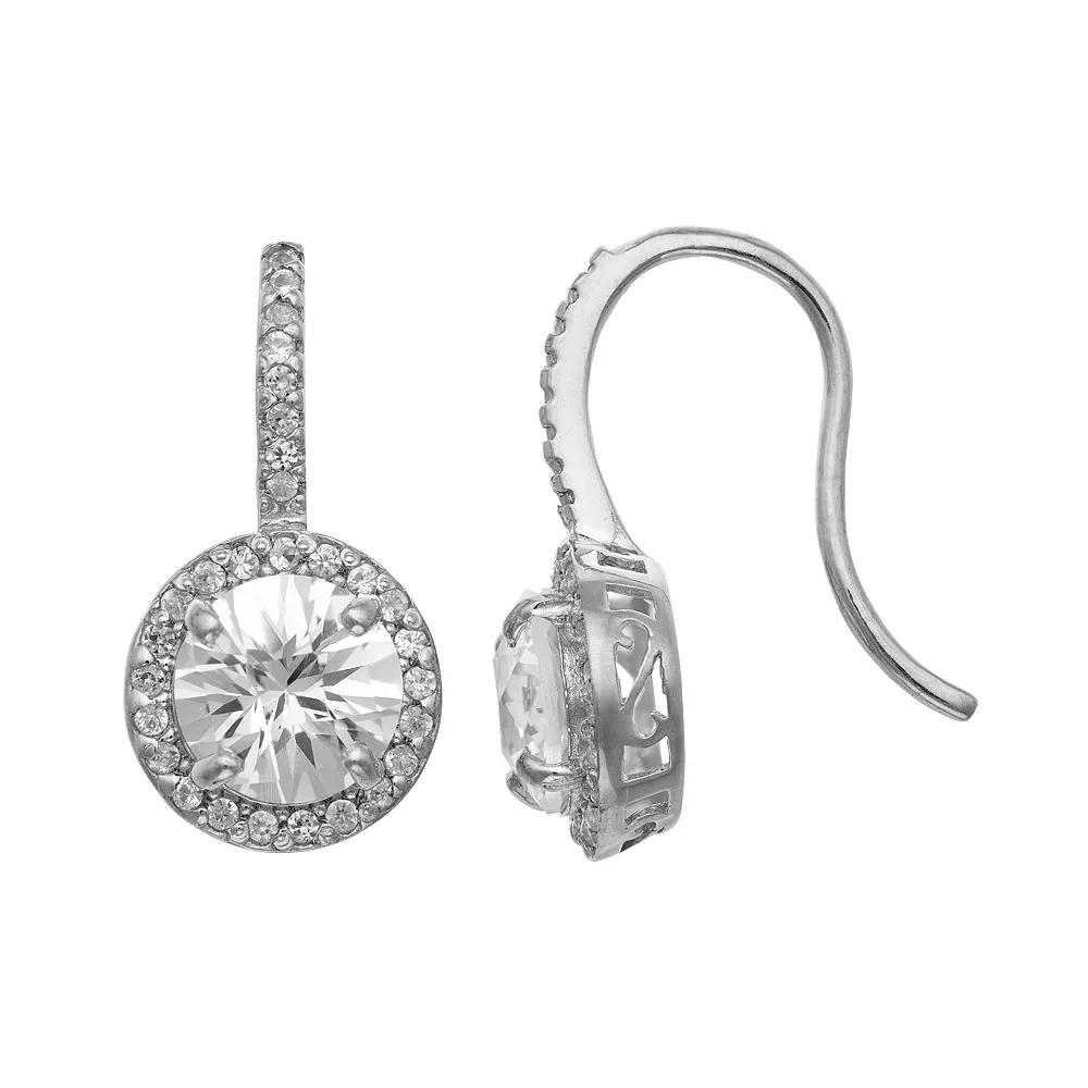 These lab-created white sapphire halo drop earrings lend a touch of elegance to all your favorite ensembles.Earring Details: Length: .75 in. Backings: fishhook Metal: rhodium-plated sterling silver Features: open-worked settingStone Details: Stone type: lab-created white sapphire Cut: checkerboard round, round Setting: prong Size: One Size. Gender: female. Age Group: adult.