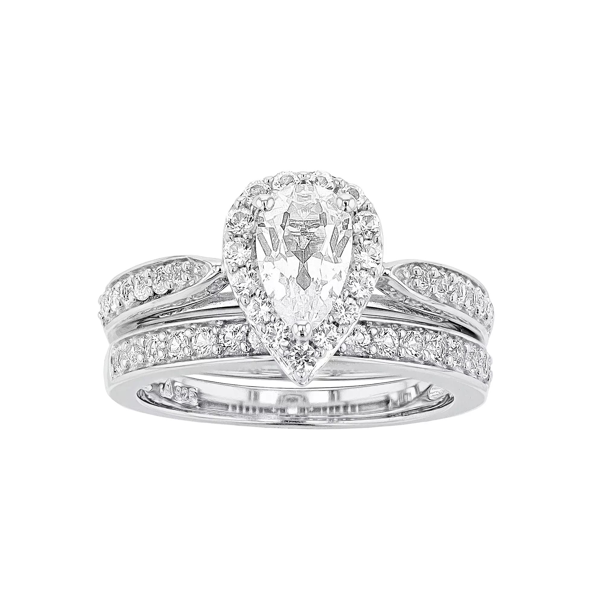 Capture her heart when you propose with this breathtaking lab-created white sapphire teardrop engagement ring set. Capture her heart when you propose with this breathtaking lab-created white sapphire teardrop engagement ring set. Width: 12.5 mm Metal: sterling silver Plating: rhodium Finish: polished Packaging: boxedSTONE DETAILS Stone type: lab-created white sapphire Total weight: 2 1/8 ct. Center stone weight: 1 1/5 ct. Center stone size: 8 mm x 5 mm Shape: pear, round Setting: prong Gemstones may have been treated to enhance their appearance. Special care may be required. Please visit our Gemstone Treatment & Special Care Guide for more information. Please note, due to the high value of this item, a signature may be required upon delivery. Gender: female. Age Group: adult.