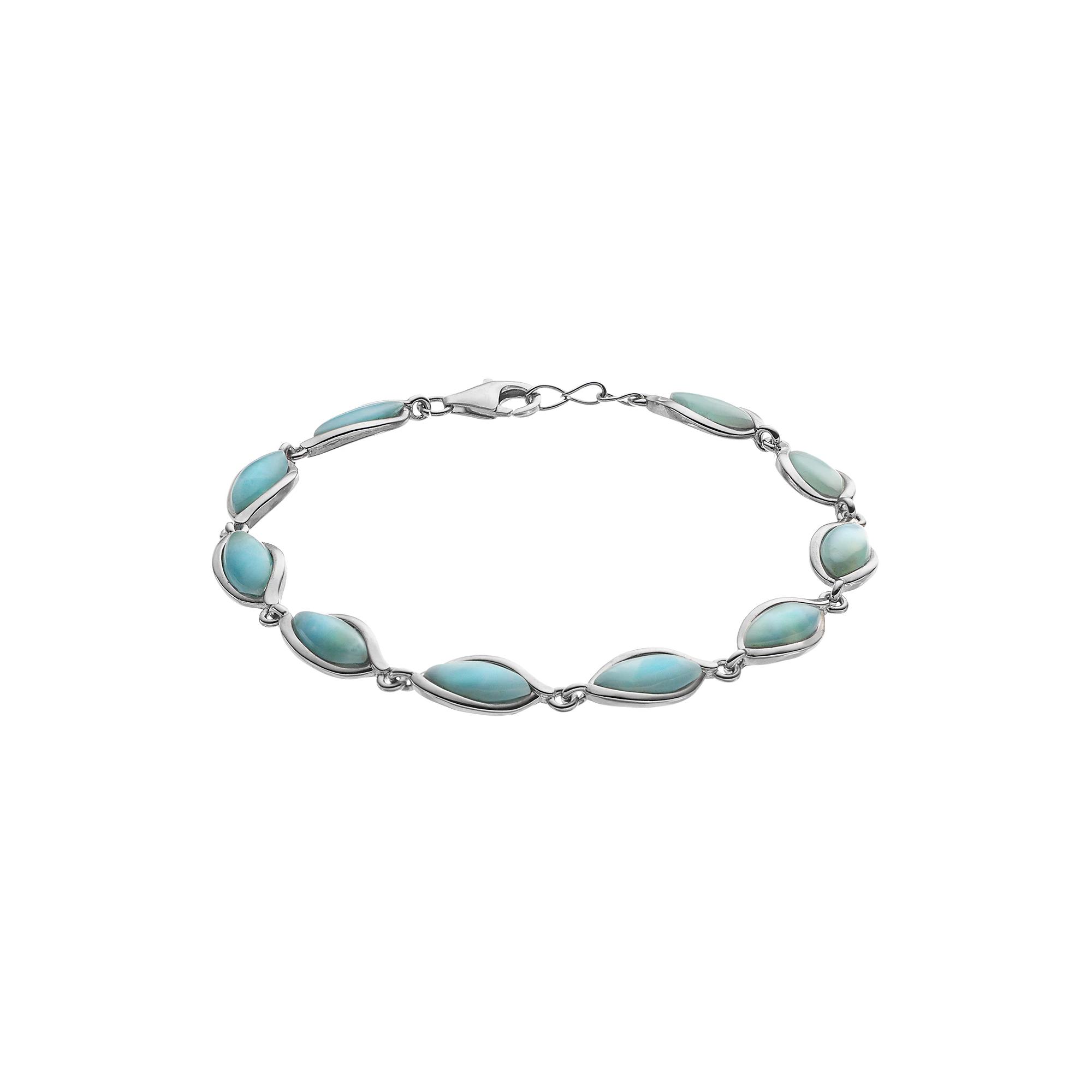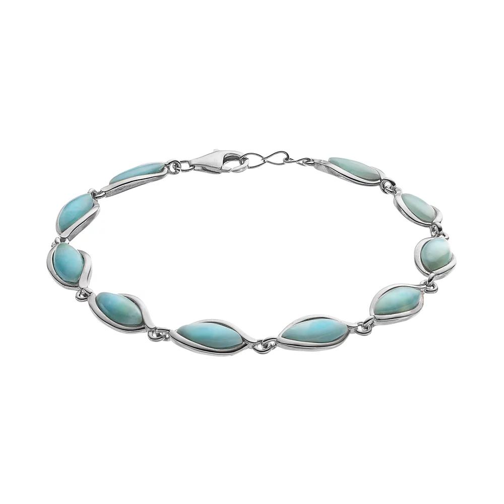 Decorated with genuine larimar marquise cabochons, this bracelet gives your outfit a lovely look.BRACELET DETAILS Length: 7.5 in. Clasp: lobster-claw Metal: sterling silver Plating: rhodium Packaging: boxed STONE DETAILS Stone type: larimar Total weight: 22 ct. Shape: marquise cabochon Setting: bezel Gemstones may have been treated to enhance their appearance. Special care may be required. Size: 7.5". Color: Blue. Gender: female. Age Group: adult. Material: Sterling Silver Rhodium.