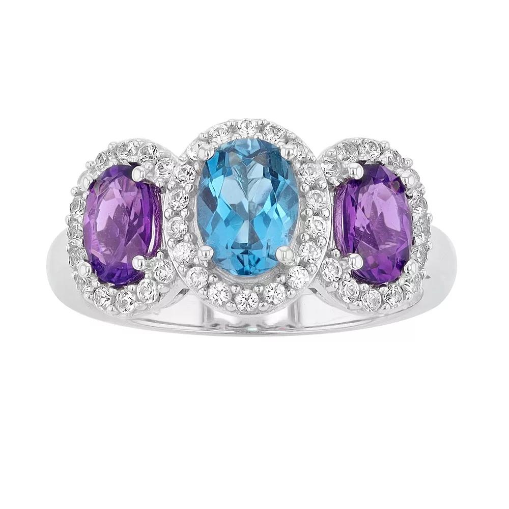 Colorful and stylish, this sterling silver gemstone ring completes your fashionable look. Colorful and stylish, this sterling silver gemstone ring completes your fashionable look. Width: 10.05 mm Metal: sterling silver Plating: rhodium Finish: polished Packaging: boxedSTONE DETAILS Stone type: London blue topaz, amethyst, lab-created white sapphire Total weight: 2 1/3 ct. Center stone size: 7 mm x 5 mm Shape: oval Setting: prong Gemstones may have been treated to enhance their appearance. Special care may be required. Please visit our Gemstone Treatment & Special Care Guide for more information. Please note, due to the high value of this item, a signature may be required upon delivery. Size: 6. Gender: female. Age Group: adult.