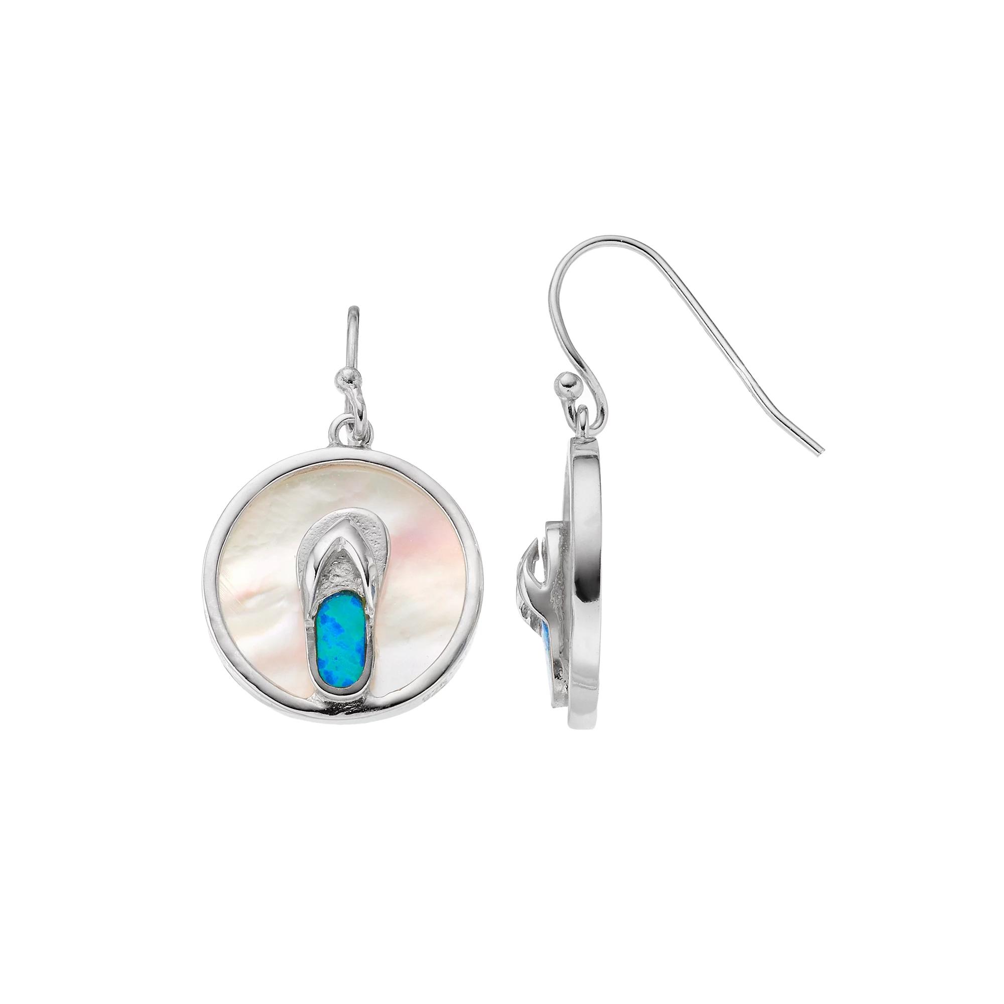 Decorated with genuine mother-of-pearl and lab-created blue opal stones, these flip-flop disc drop earrings offer laid-back appeal.EARRING DETAILS Length: 1.18 in. Backings: fishhook Metal: sterling silver Plating: rhodium Packaging: boxed STONE DETAILS Stone type: mother-of-pearl, lab-created blue opal Total weight: 11 ct. Center stone size: 18 mm x 18 mm Shape: round cabochon, oval cabochon Setting: bezel Gemstones may have been treated to enhance their appearance. Special care may be required. Please visit our Gemstone Treatment & Special Care Guide for more information. Gender: female. Age Group: adult. Material: Sterling Silver Rhodium.