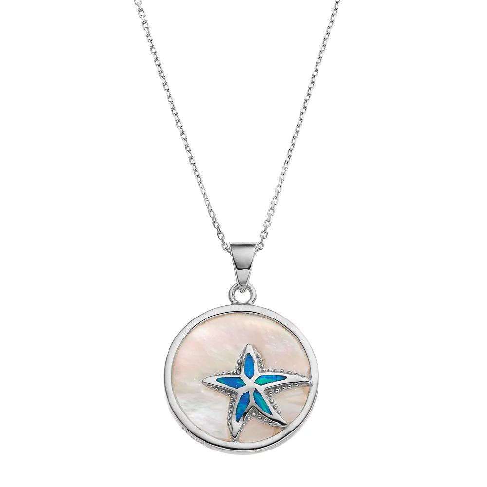 Adorned with genuine mother-of-pearl and lab-created blue opal stones, this starfish disc necklace exudes beachside style.PENDANT DETAILS Pendant length: 1.13 in. Chain length: 18 in. Chain type: rolo Clasp: spring-ring Metal: sterling silver Plating: rhodium Packaging: boxed STONE DETAILS Stone type: mother-of-pearl, lab-created blue opal Total weight: 7 3/4 ct. Center stone size: 20 mm x 20 mm Shape: round cabochon Setting: bezel, inlay Gemstones may have been treated to enhance their appearance. Special care may be required. Please visit our Gemstone Treatment & Special Care Guide for more information. Size: 18". Gender: female. Age Group: adult. Material: Sterling Silver Rhodium.