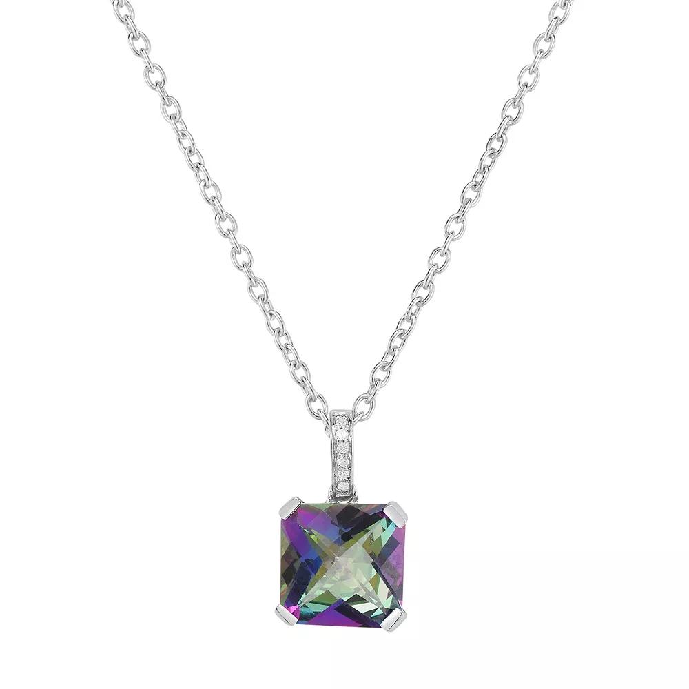 Enchanting style is effortless when you don this Mystic Topaz and diamond accent necklace. PENDANT DETAILS Pendant length: 0.61 in. Chain length: 18 in. Chain type: rolo Clasp: lobster-claw Metal: sterling silver Plating: rhodium Finish: polished Packaging: boxed STONE DETAILS Stone type: Mystic Topaz Total weight: 4 ct. Center stone size: 9 mm Shape: cushion cut Setting: prong DIAMOND DETAILS Total weight: less than 1/10 ct. Shape: round Color grade: I Clarity: I2-I3 Setting: prong Gemstones may have been treated to enhance their appearance. Special care may be required. Please visit our Gemstone Treatment & Special Care Guide for more information.Image(s) may be enlarged to show detail.Diamond weights are approximate. Diamond total weights may vary between .01 and .08 ct. Some diamonds have fewer than 17 facets. Color: Green. Gender: female. Age Group: adult.