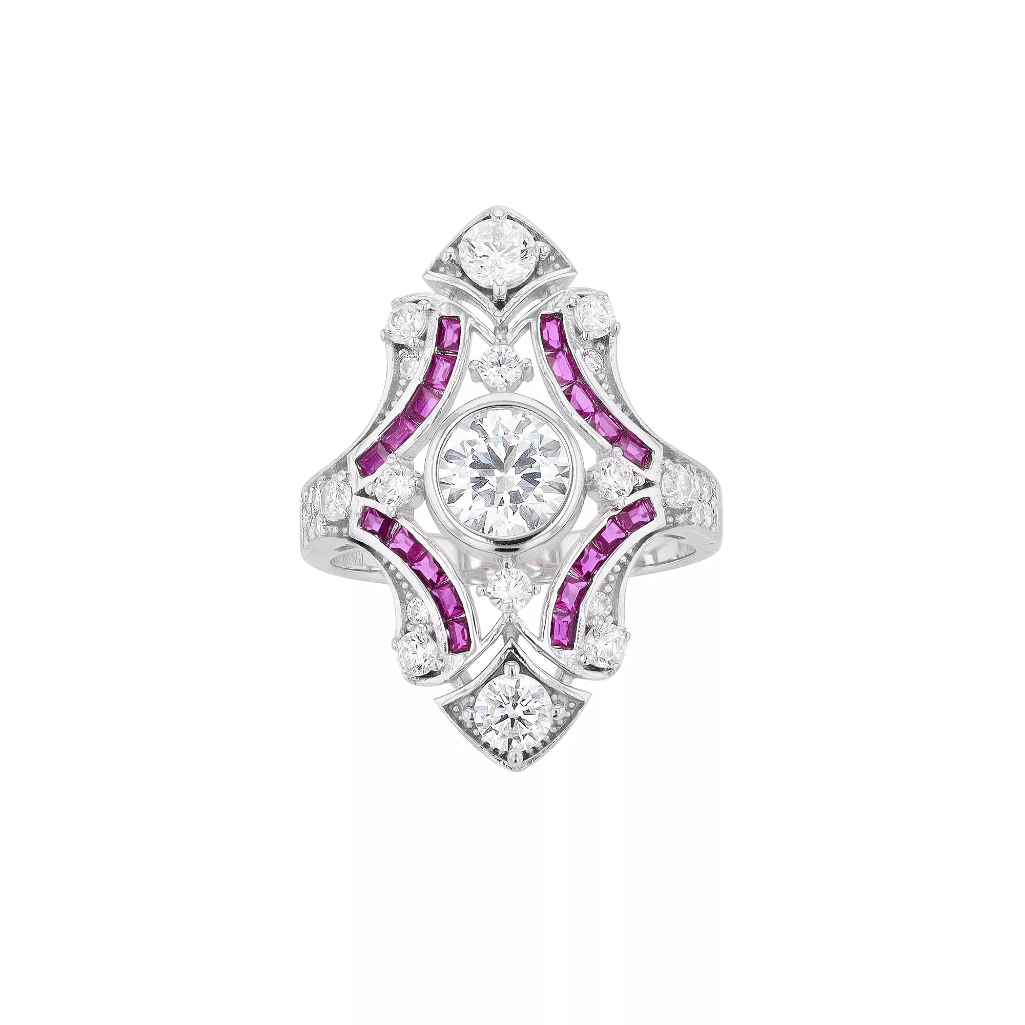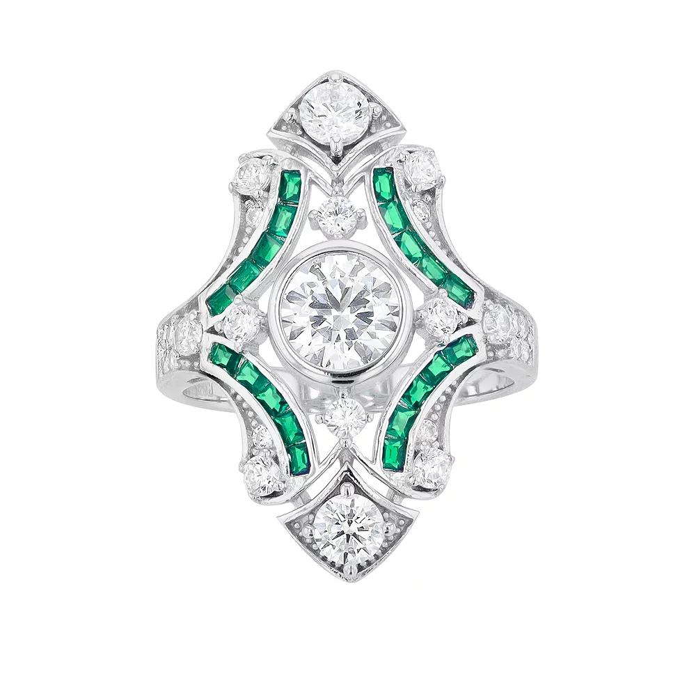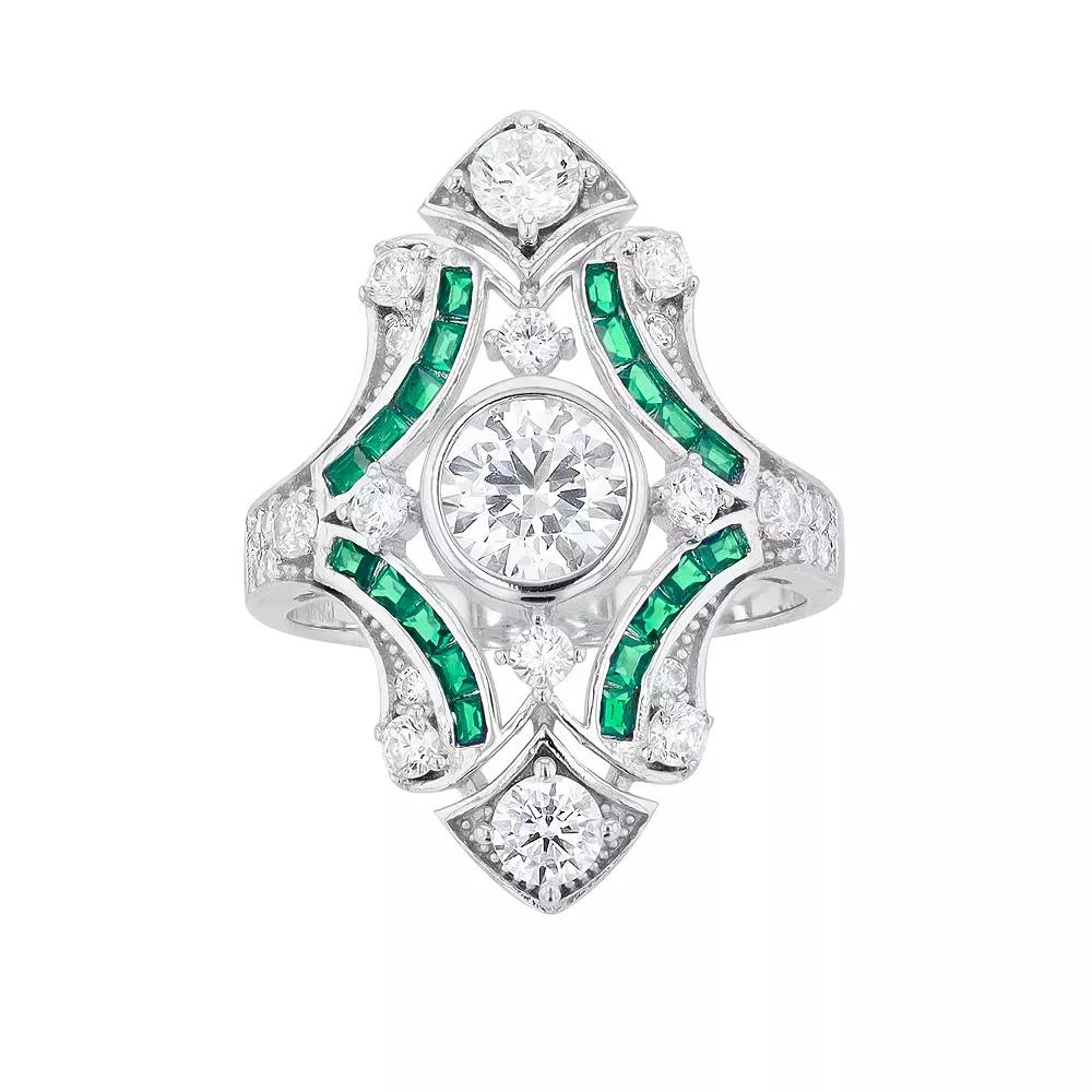 Add a touch of vintage-inspired elegance to your wardrobe with this green and clear cubic zirconia cocktail ring. Add a touch of vintage-inspired elegance to your wardrobe with this green and clear cubic zirconia cocktail ring. Metal: sterling silver Packaging: boxed Plating: rhodium Width: 3.1 mm Finish: polishedSTONE DETAILS Stone type: cubic zirconia Total weight: 2 3/8 ct. Shape: baguette cut, round Gemstones may have been treated to enhance their appearance. Special care may be required. Please visit our Gemstone Treatment & Special Care Guide for more information. Size: 7. Color: White. Gender: female. Age Group: adult.