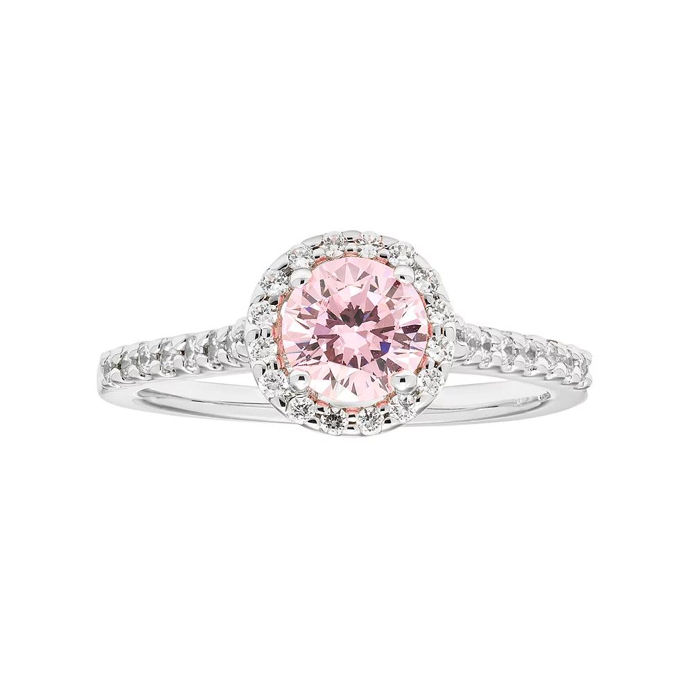 Adorned with a striking pink cubic zirconia center stone, this sterling silver halo engagement ring is a beautiful symbol of your commitment.RING DETAILS Width: .3 in. Metal: sterling silver Packaging: boxed CUBIC ZIRCONIA DETAILS Total weight: 1 3/4 ct. Center stone size: 6 mm x 6 mm Shape: round Color: pink, white Setting: prong Gemstones may have been treated to enhance their appearance. Special care may be required. Size: 5. Gender: female. Age Group: adult.