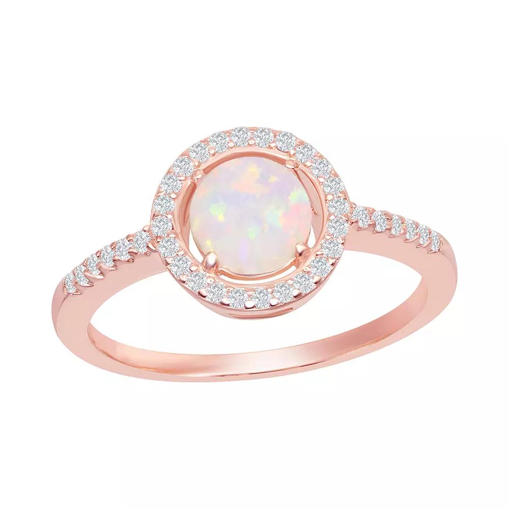 Youll love the impressive design of this beautiful ring with white opal and cubic zirconia. Youll love the impressive design of this beautiful ring with white opal and cubic zirconia. Packaging: boxed Metal: sterling silver Plating: sterling silver Finish: polished Width: .6 in Additional details: nickel freeSTONE DETAILS Stone type: cubic zirconia Shape: round Setting: prong Gemstones may have been treated to enhance their appearance. Special care may be required. Color: Pink. Gender: female. Age Group: adult. Material: Gold Over Sterling.
