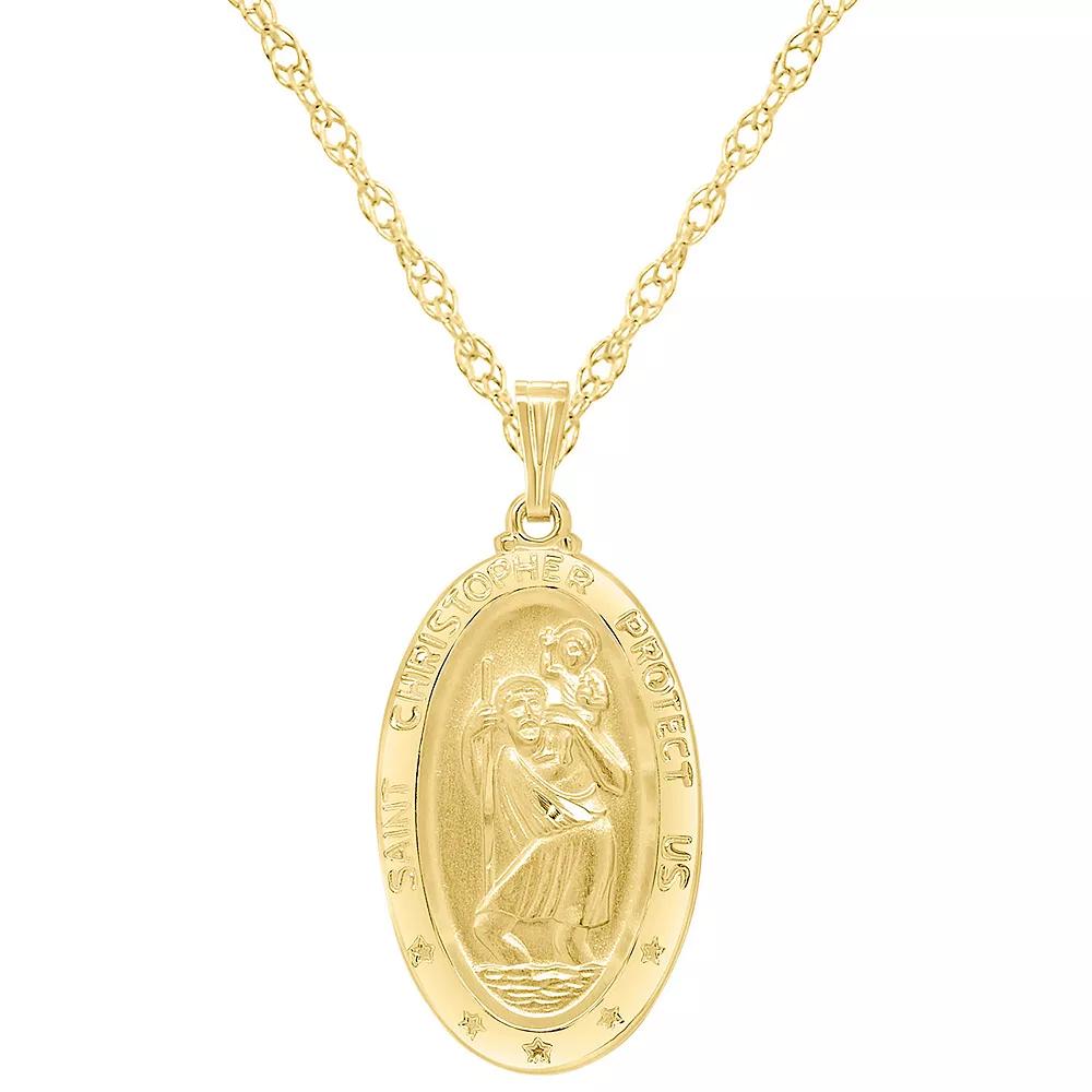 This exquisite oval medallion pendant necklace features a Saint Christopher design and inscription symbolizing protection and guidance. Available in your choice of Sterling Silver or 14K Gold Plated Sterling Silver. | Belk & Co Sterling Silver Saint Christopher Oval Medallion Pendant Necklace