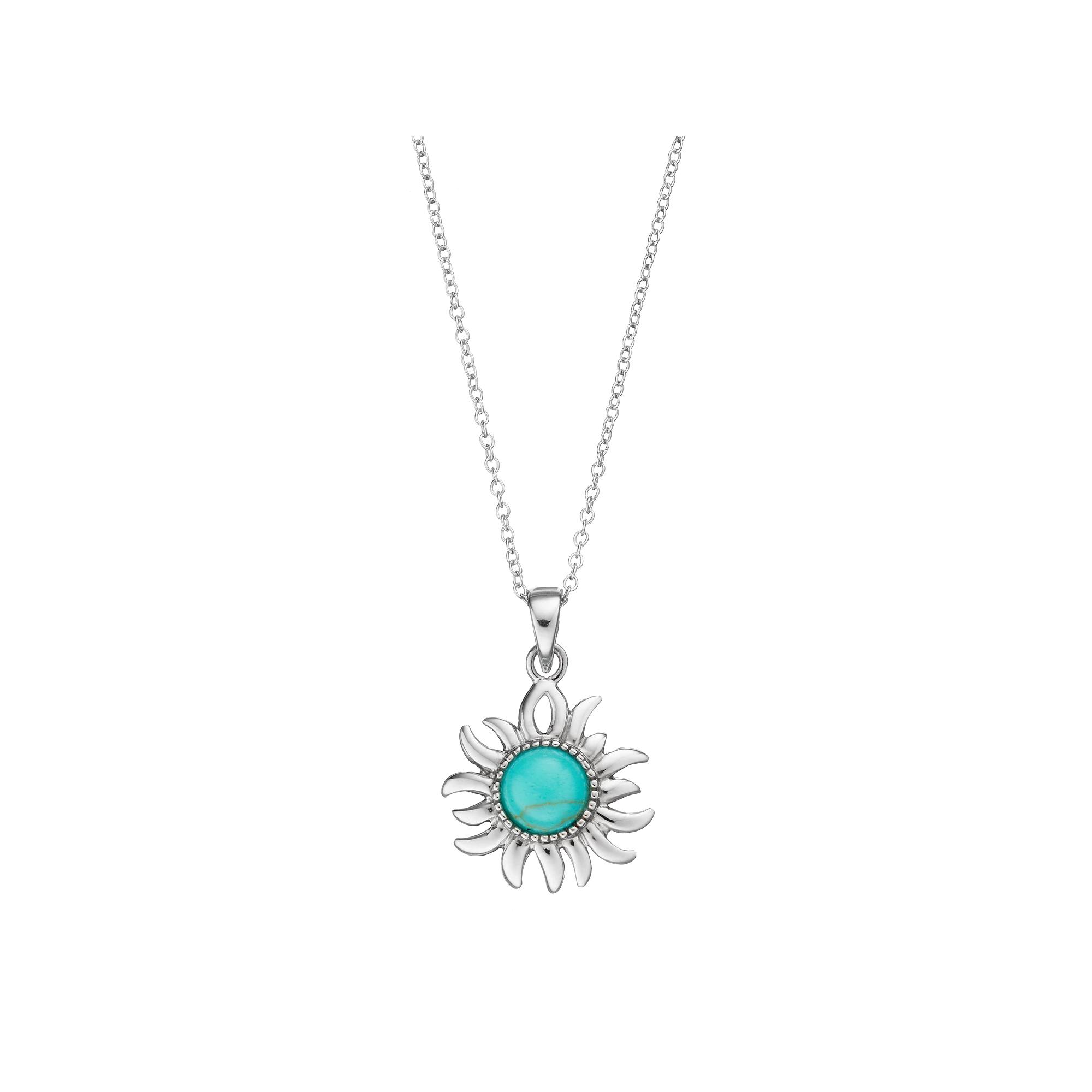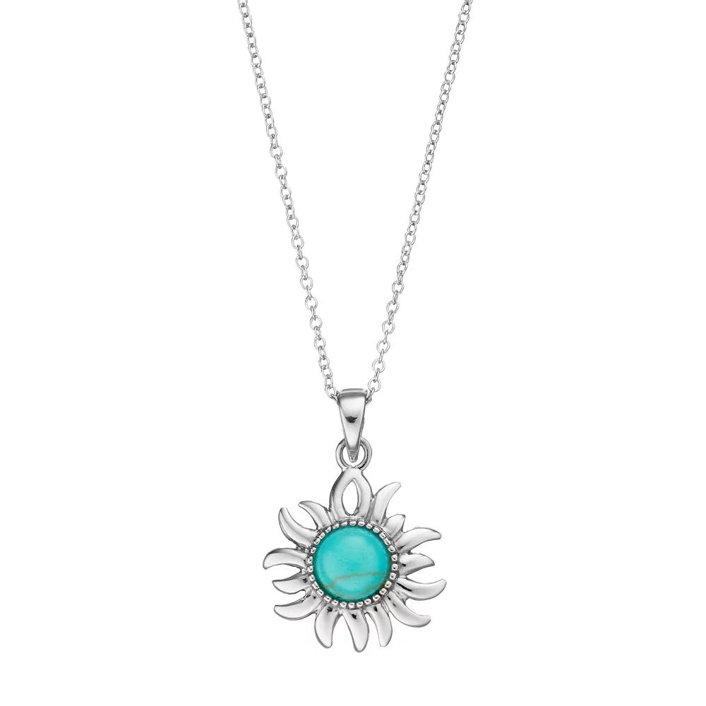 Showcase your love of nature when you add this sterling silver simulated turquoise sun pendant to your lok.PENDANT DETAILS Pendant length: .9 in. Chain length: 18 in. Clasp: spring-ring Metal: sterling silver Finish: polished & oxidized Stone type: simulated turquoise Center stone size: 6 mm Shape: round Setting: bezel Gemstones may have been treated to enhance their appearance. Special care may be required. Size: 18". Color: Blue. Gender: female. Age Group: adult.