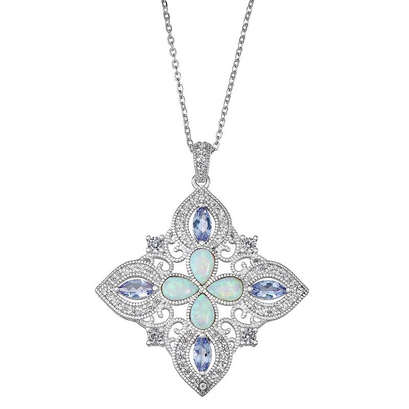 Decorated with gemstones and opal accents, this sterling silver pendant offers an alluring way to update your ensemble. Decorated with gemstones and opal accents, this sterling silver pendant offers an alluring way to update your ensemble. PENDANT DETAILS Chain length: 18-in. Clasp: spring-ring Metal: sterling silver Plating: rhodium Finish: polished Packaging: boxed STONE DETAILS Stone types: lab-created opal, lab-created white sapphire & tanzanite Total weight: 2 ct. Shape: marquise, pear & round Setting: prong Size: One Size. Color: Blue. Gender: female. Age Group: adult.
