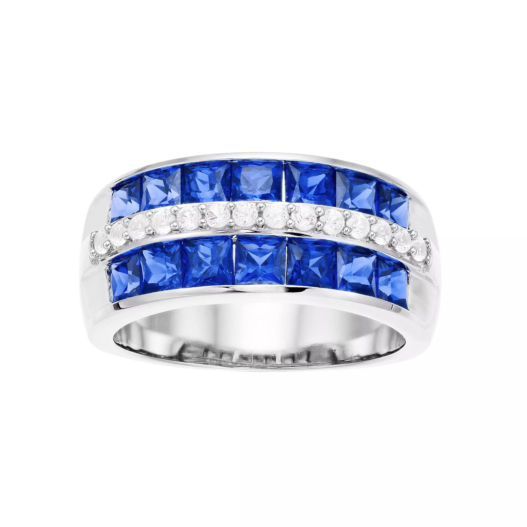 This sterling silver ring features three rows of beautiful gemstones for a stunning look. This sterling silver ring features three rows of beautiful gemstones for a stunning look. RING DETAILS Width: 0.36-in. Metal: sterling silver Plating: rhodium Finish: polished Packaging: boxed STONE DETAILS Stone type: lab-created sapphire Shape: square Color: blue, white Setting: channel, prong Gemstones may have been treated to enhance their appearance. Special care may be required. Please visit our Gemstone Treatment & Special Care Guide for more information. Size: 8. Gender: female. Age Group: adult.