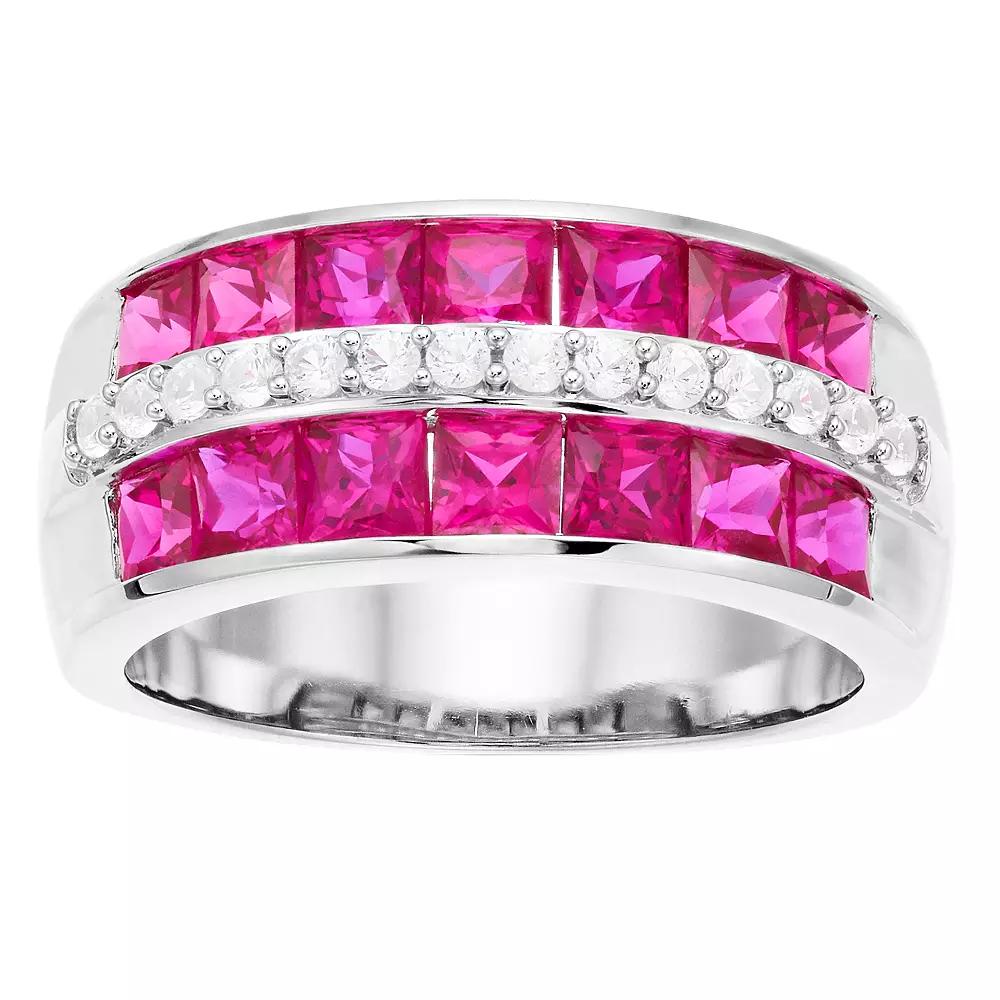 This sterling silver ring features three rows of beautiful gemstones for a stunning look. This sterling silver ring features three rows of beautiful gemstones for a stunning look. RING DETAILS Width: 0.36-in. Metal: sterling silver Plating: rhodium Finish: polished Packaging: boxed STONE DETAILS Stone type: lab-created ruby Shape: square Color: red, white Setting: channel, prongGemstones may have been treated to enhance their appearance. Special care may be required. Please visit our Gemstone Treatment & Special Care Guide for more information. Gender: female. Age Group: adult.