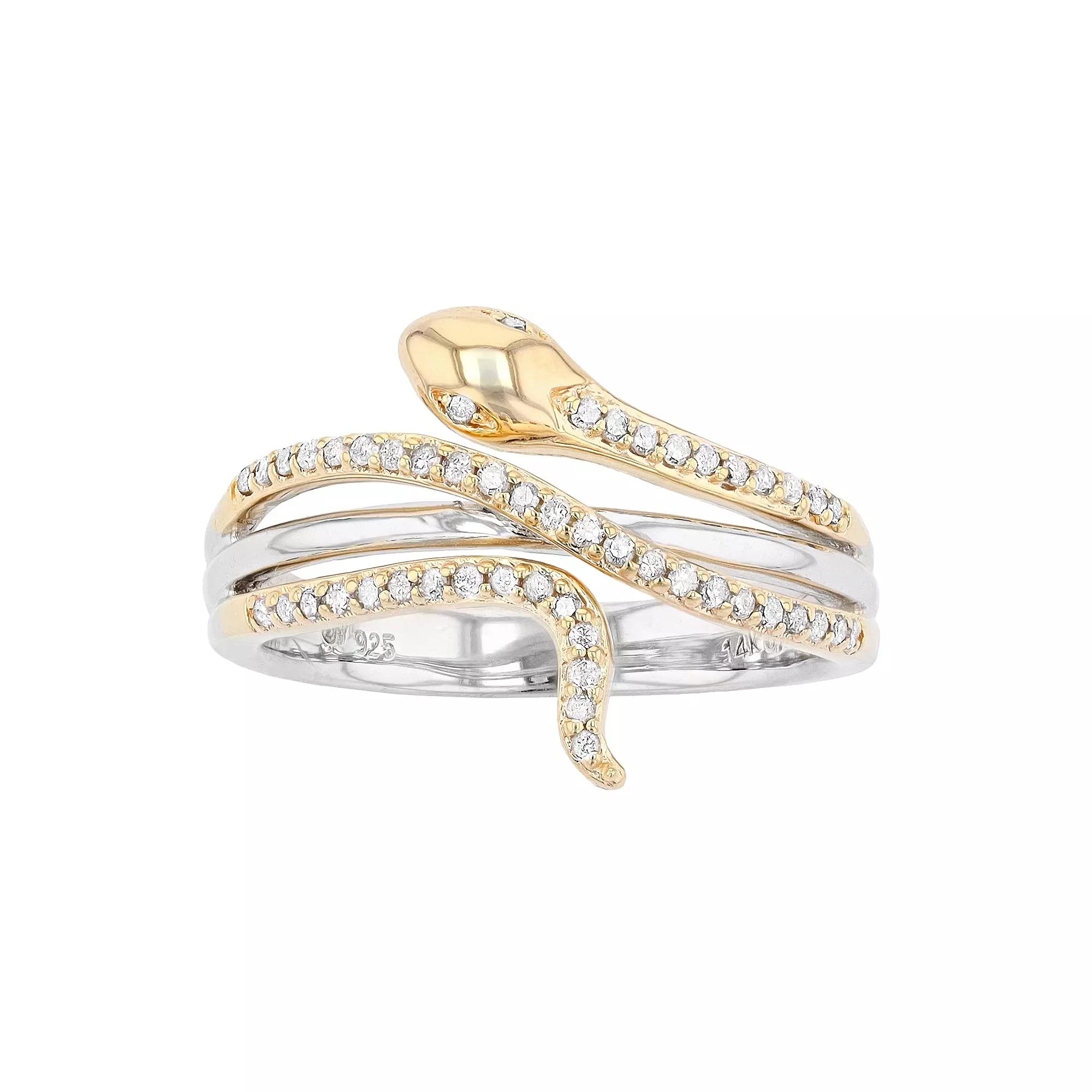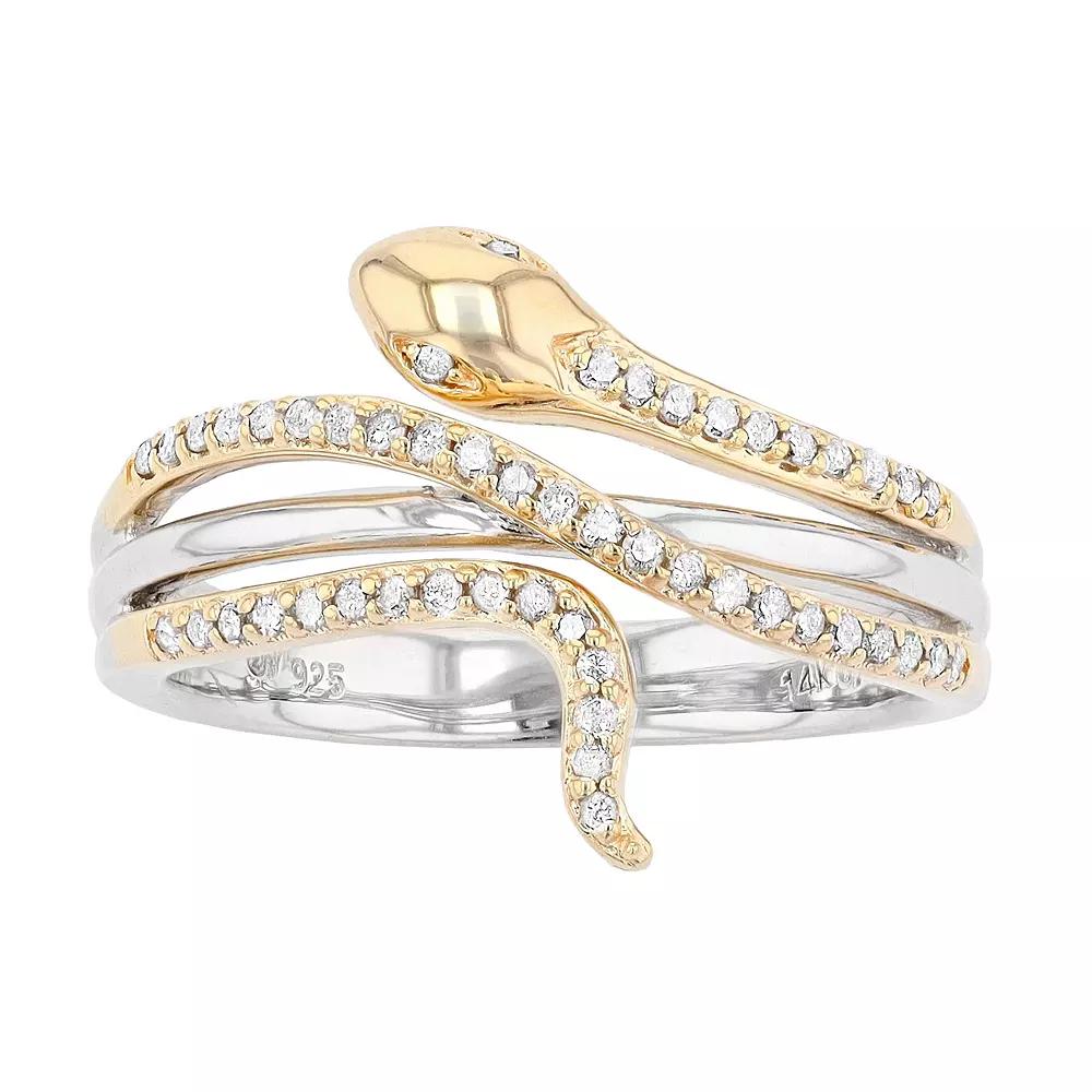 Crafted from sterling silver, and accented with diamonds and 14k gold details, this stylish snake ring is sure to charm. Crafted from sterling silver, and accented with diamonds and 14k gold details, this stylish snake ring is sure to charm. Width: 17.3 mm Metal: sterling silver Plating: 14k gold, rhodium Finish: polished Packaging: boxedDIAMOND DETAILS Total weight: 1/5 ct. Color grade: I-J Clarity: I2-I3 Shape: round Setting: prong Gemstones may have been treated to enhance their appearance. Special care may be required. Please visit our Gemstone Treatment & Special Care Guide for more information. Diamond weights are approximate. Diamond total weights may vary between .01 and .08 ct. Some diamonds have fewer than 17 facets. Image(s) may be enlarged to show detail. Please note, due to the high value of this item, a signature may be required upon delivery. Color: White. Gender: female. Age Group: adult. Material: Gold Over Sterling.