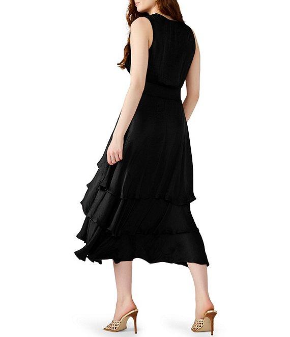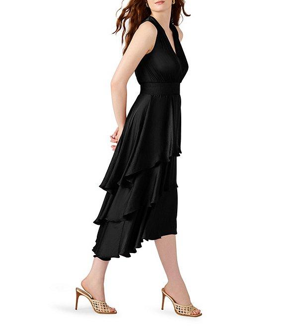 From Steve Madden, this dress features: Washed satin fabrication V-neckline Sleeveless Pull-on construction Tiered hemline Smocked waistband Midi length Approx. 46.5" length Polyester Machine wash cold, tumble dry low Imported.