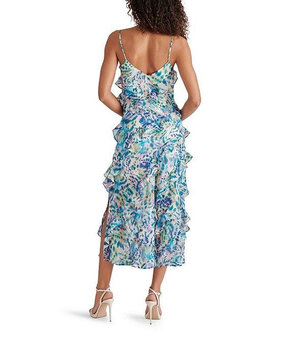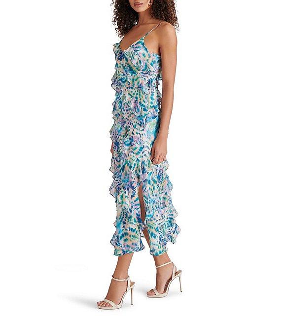 Steve Madden Dion Woven Floral Print V-Neck Sleeveless Asymmetrical Ruffle Slip Midi Dress