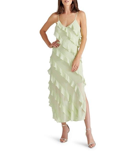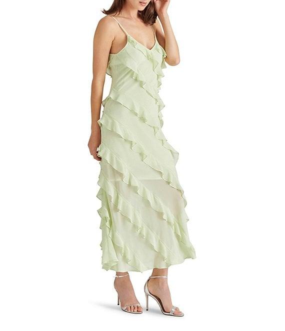 Steve Madden Dion Woven V Neck Sleeveless Asymmetrical Ruffle Slip Midi Dress