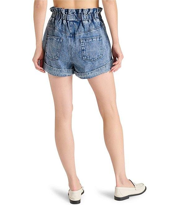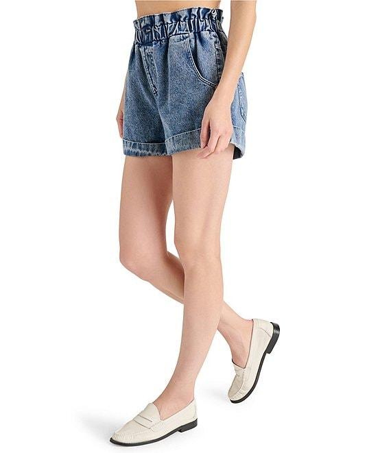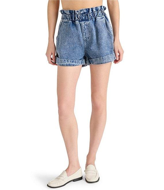 From Steve Madden, these shorts feature: Denim Fabrication Front button/zip closure Side pocket detail Elastic waist detail Approx. 2.5" inseam, 1.125" front rise, 1.125" back rise, 28" leg opening, 1.25"hem Cotton Machine wash/tumble dry Imported.