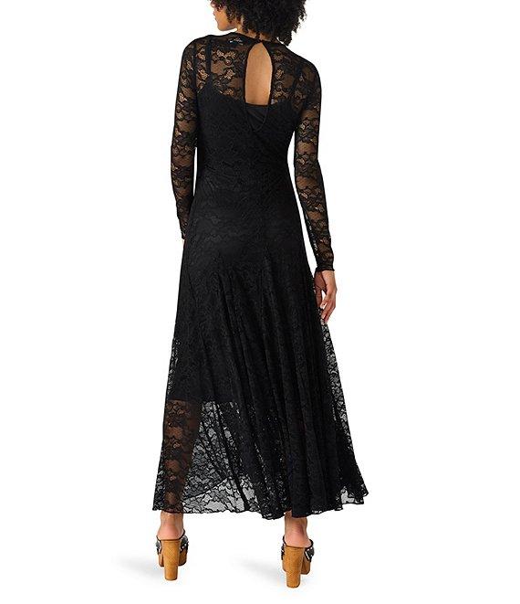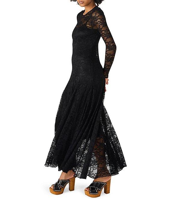 From Steve Madden, this dress features: Knit fabrication Sheath silhouette Crew neckline Long sleeves Sheer lace overlay Slip/lining underneath Maxi Back keyhole with button Approx. 49.5" length Nylon/spandex; lining: polyester Dry clean only Imported.