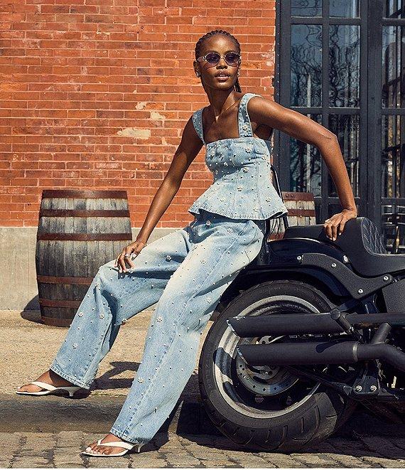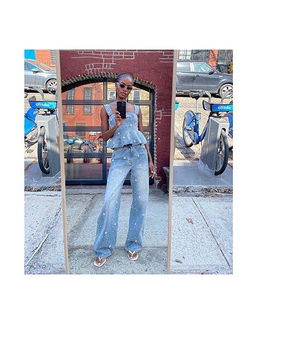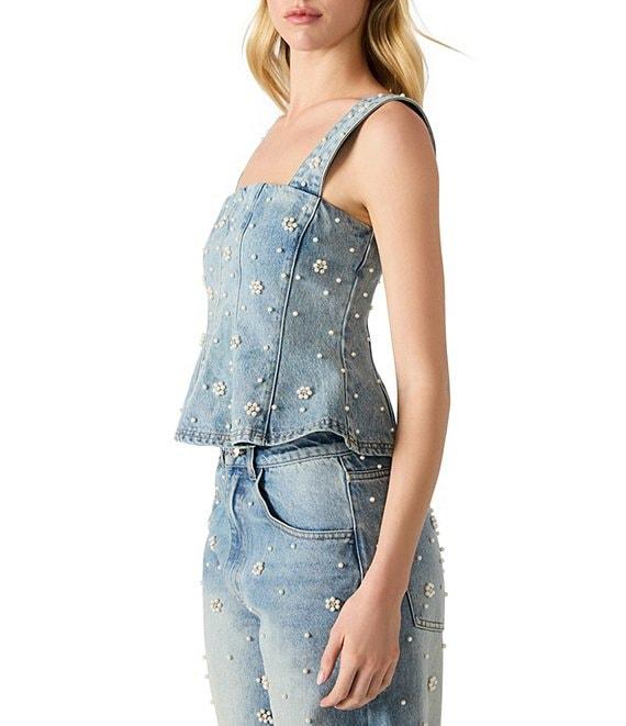 Steve Madden Fiorella Pearl Floral Pattern Embellished Peplum Denim Coordinating Top