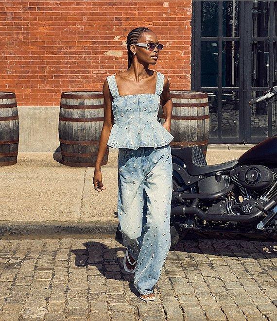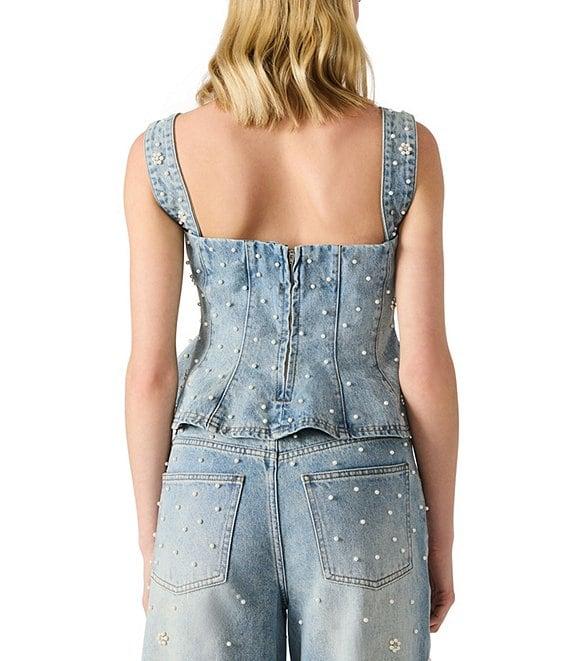 From Steve Madden, this top features: Denim fabrication Square neckline Sleeveless Peplum silhouette Pearl flower pattern embellishment detail Zipper closure Approx. 21" length Cotton Hand wash Imported.