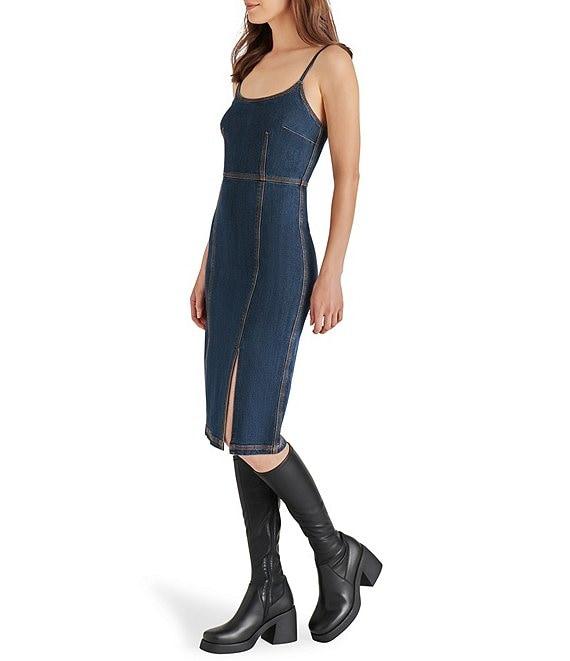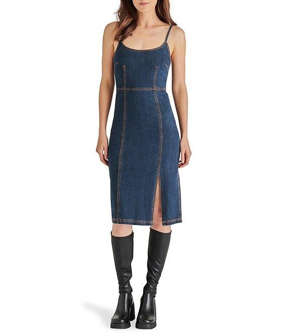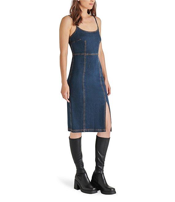 From Steve Madden, this dress features: Denim fabrication Scoop neckline Sleeveless Contrasting seam detail Side slit detail Zip closure Approx. 42.87" length Cotton/spandex Hand wash Imported.