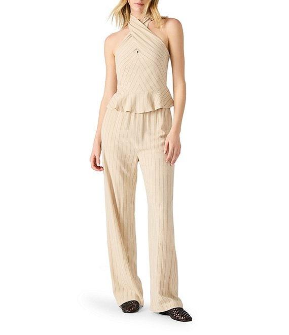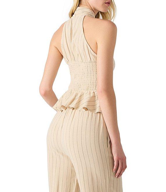 From Steve Madden, this top features:Cotton blend Pin stripe print Halter criss-cross neckline Sleeveless Peplum hemline Center back zip closure Approx. 24" lengthCotton/nylonMachine washImported.