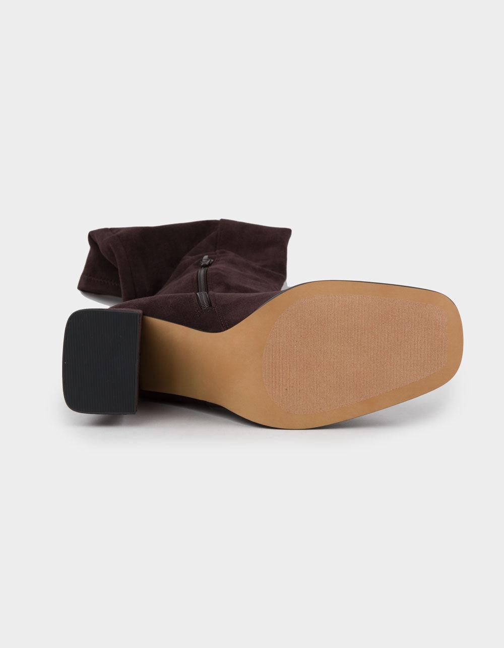 Steve Madden Livah Knee High Boots. Faux leather boots featuring a knee-high silhouette, square toe and block heel. Approximate heel height: 3 1/2". 15" shaft. Side zip closure. Synthetic upper/synthetic and textile lining/synthetic sole. Imported.