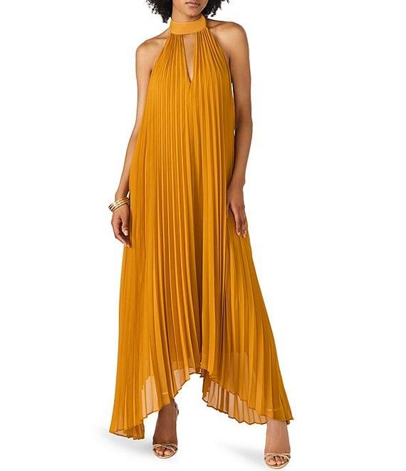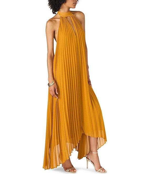 Steve Madden Maraya Woven Mesh Halter V-Neck Open Back Pleated Maxi Dress