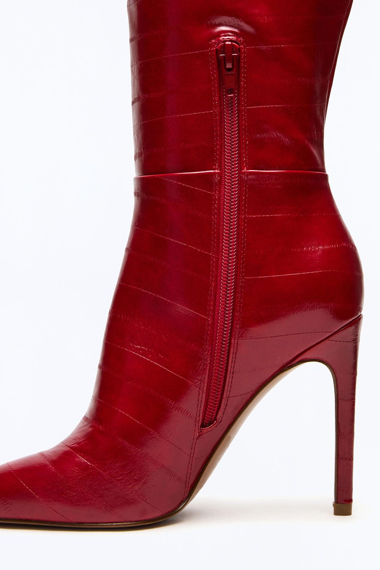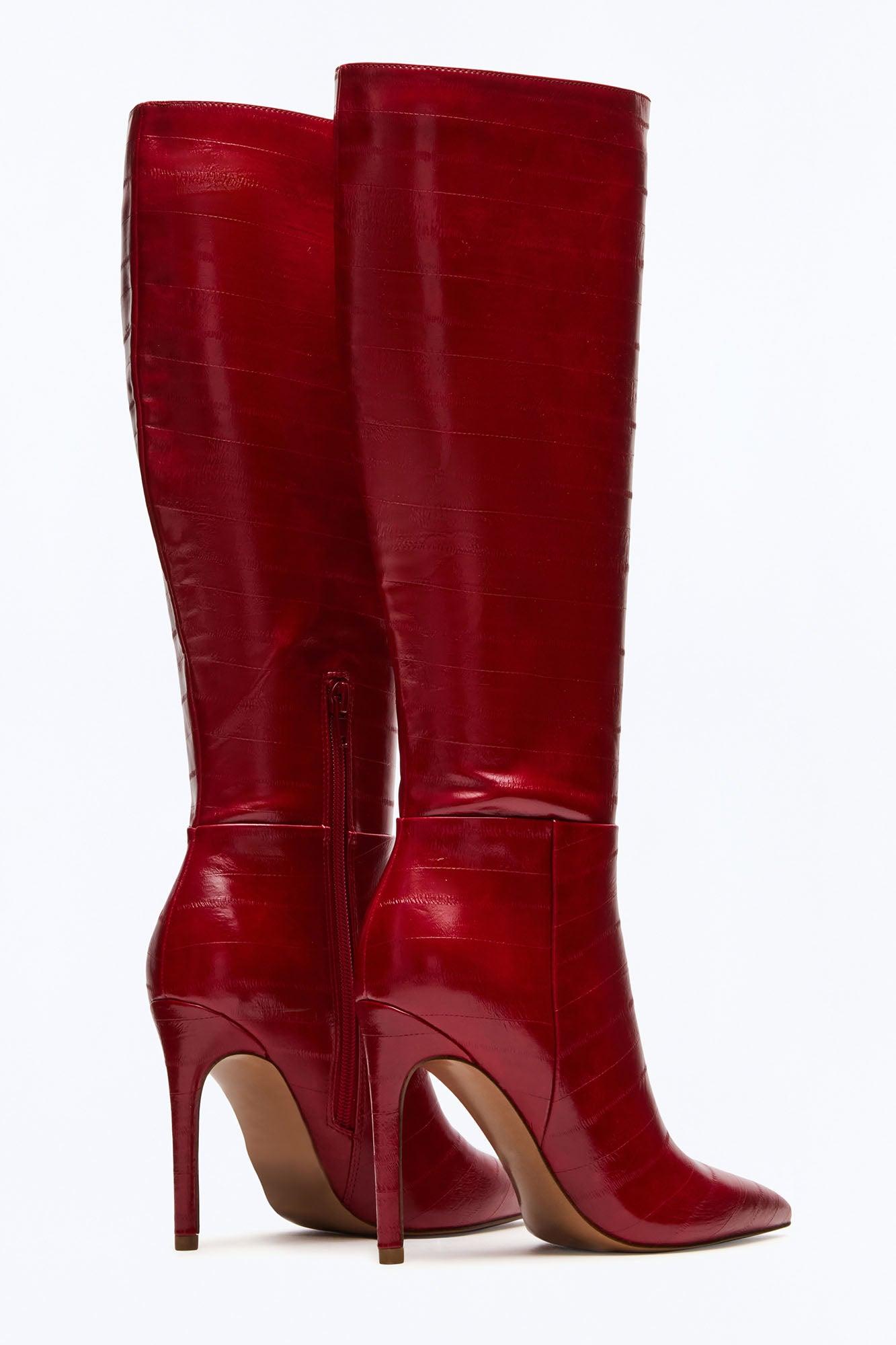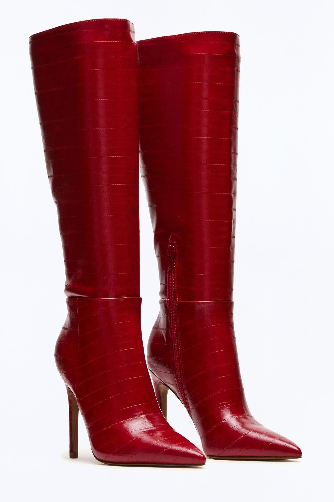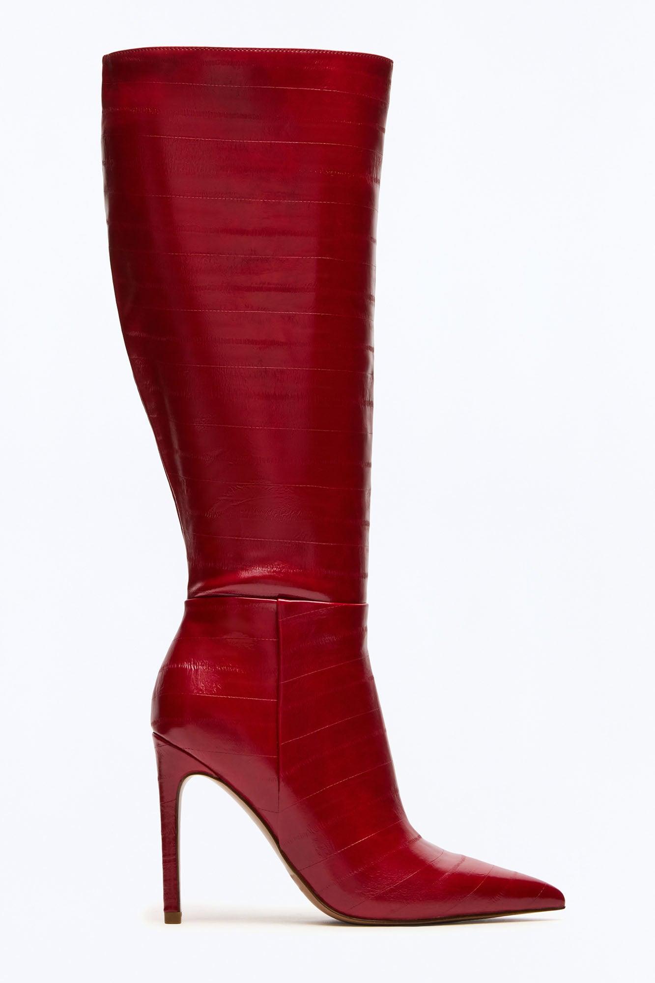 Available In Black And Red. 4 inch heel height Size 6 measurements: 13.39 inch shaft circumference, 15 inch shaft height Size 8 measurements: 13.78 inch shaft circumference, 15.82 inch shaft height Size 10 measurements: 14.17 inch shaft circumference, 16.69 inch shaft height For correct calf measurements, measure your bare calf at its widest circumference with your foot flat on the ground Vegan leather upper material Textile and vegan leather lining Vegan leather sock Synthetic sole Imported