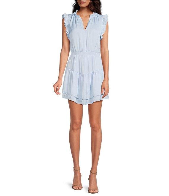 From Steve Madden, this dress features:Soft satin fabricationBlouson silhouetteRuffle split v-necklineRuffle cap sleevesSmocked waistmini length Pullover constructionApprox. 33.5" lengthPolyesterHand wash or dry cleanImported.